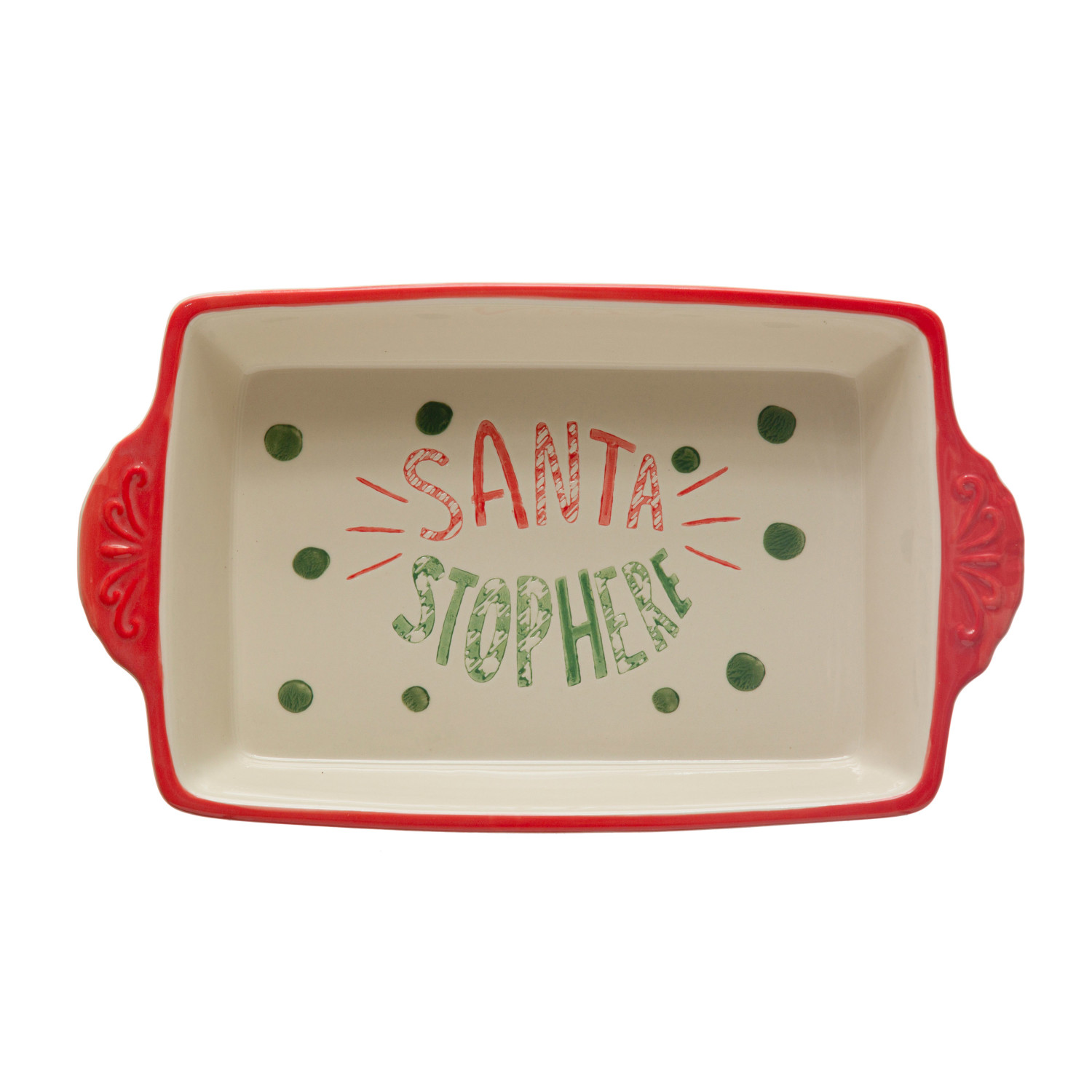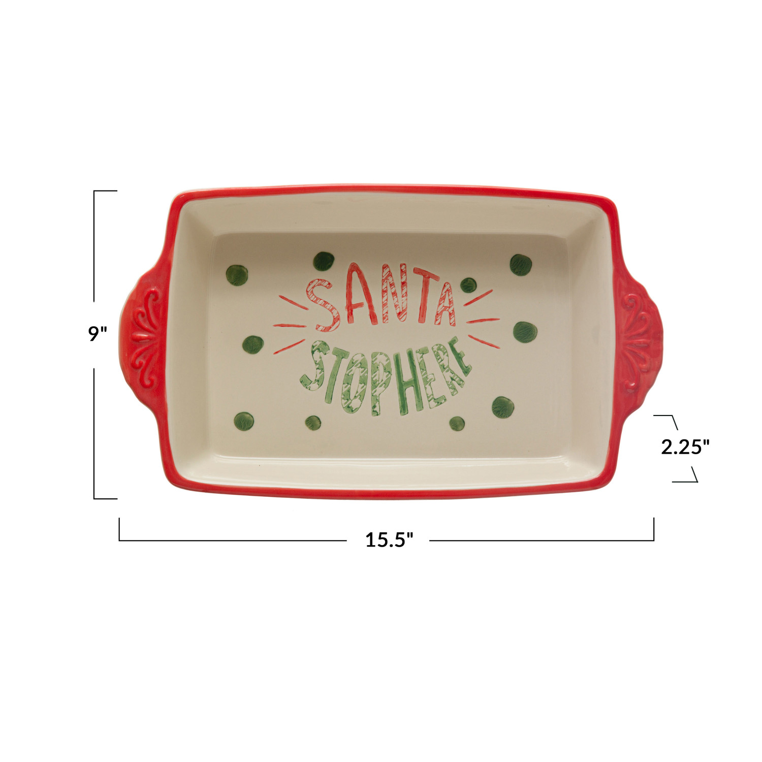 Catalog Name: 15-1/2"L x 9"W x 2-1/4"H 2-1/2 Quart Hand-Painted Stoneware Baker w/ Handles & Red Rim "Santa Stop Here", Red & Green