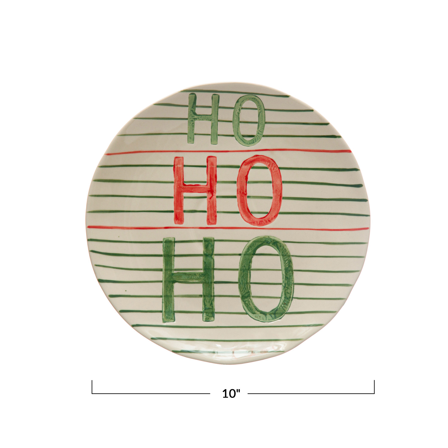 Catalog Name: 10" Round Hand-Painted Stoneware Plate w/ Stripes "Ho Ho Ho", Red & Green