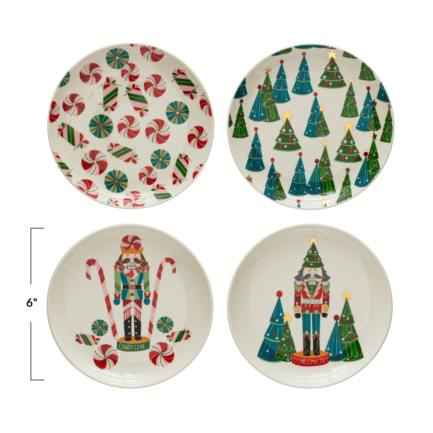 6" Round Stoneware Plate w/ Holiday Pattern/Image, Multi Color, 4 Styles