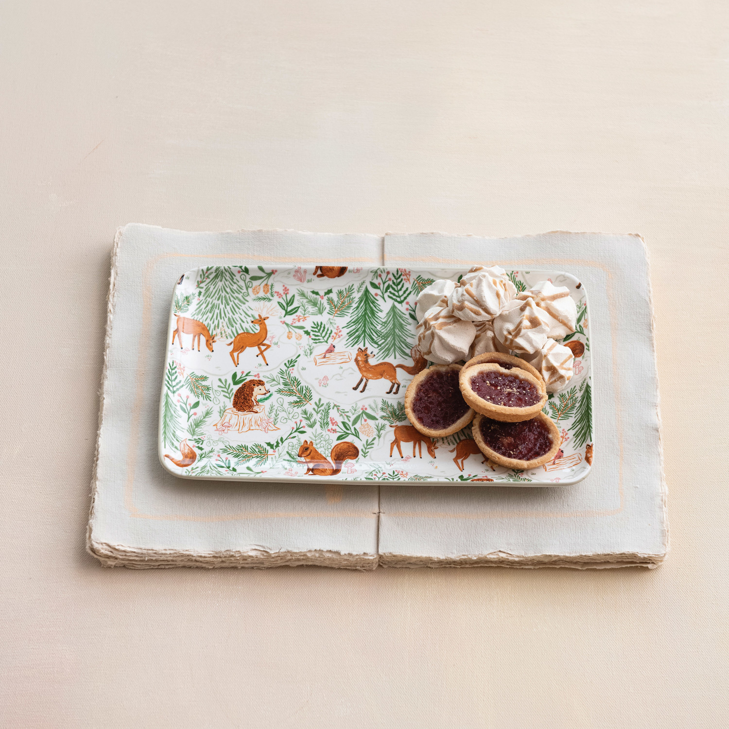Catalog Name: 11-1/4"L x 6-1/2"W Stoneware Platter w/ Woodland Flora/Fauna Pattern, Multi Color ©