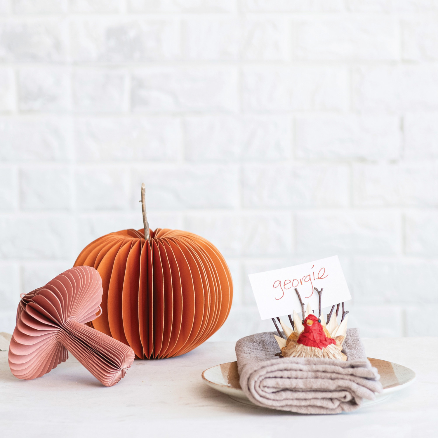 This set of dried natural corn husk turkeys with place card/photo holders, natural and orange, in a box is a festive and rustic accessory for the fall or Thanksgiving table. The set includes three turkeys that feature dried natural corn husks in natural and orange colors, twigs for legs and tails, and foam for heads and beaks. The turkeys are handmade with care and attention to detail and have a natural and cozy texture. The turkeys also have metal clips that can hold place cards or photos. The set comes in a box, which makes it easy to store or gift. The turkeys measure 3 inches in length and 3 inches in height. The round shape is simple and elegant and can be placed on any surface. The turkeys are ideal for holding place cards or photos or for adding some charm and fun to table setting. Whether hosting a family dinner, a friends' gathering, or a potluck, these will make the table more festive and rustic.