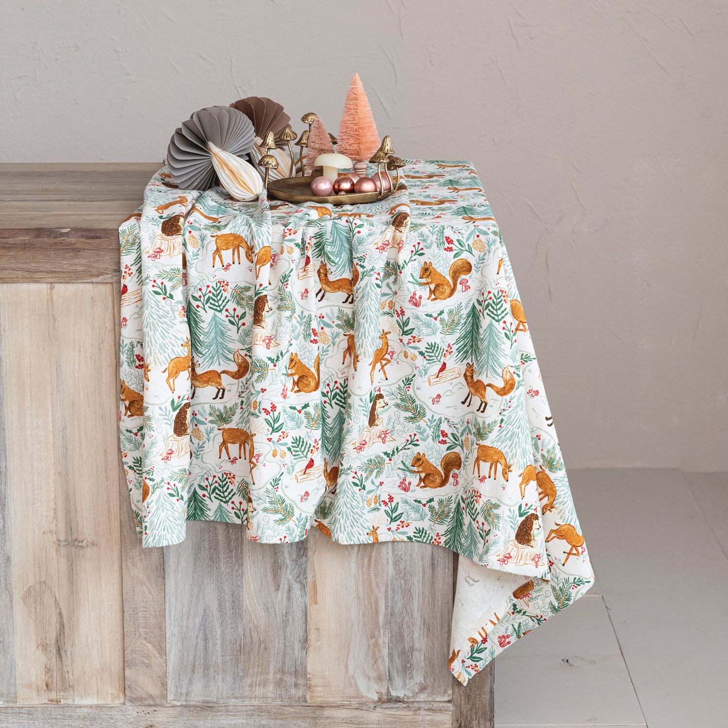 Catalog Name: 84"L x 60"W Cotton Printed Tablecloth w/ Woodland Flora/Fauna Pattern, Multi Color ©