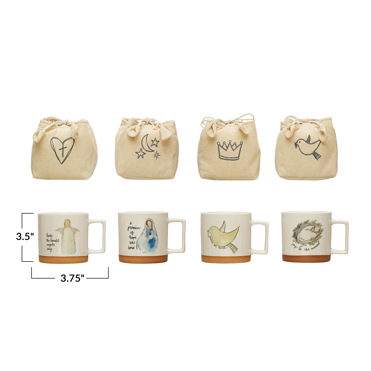 Catalog Name: 3-3/4" Round x 3-1/2"H 12 oz. Stoneware Mug w/ Christmas Saying & Image in Printed Drawstring Bag, Multi Color, 4 Styles ©