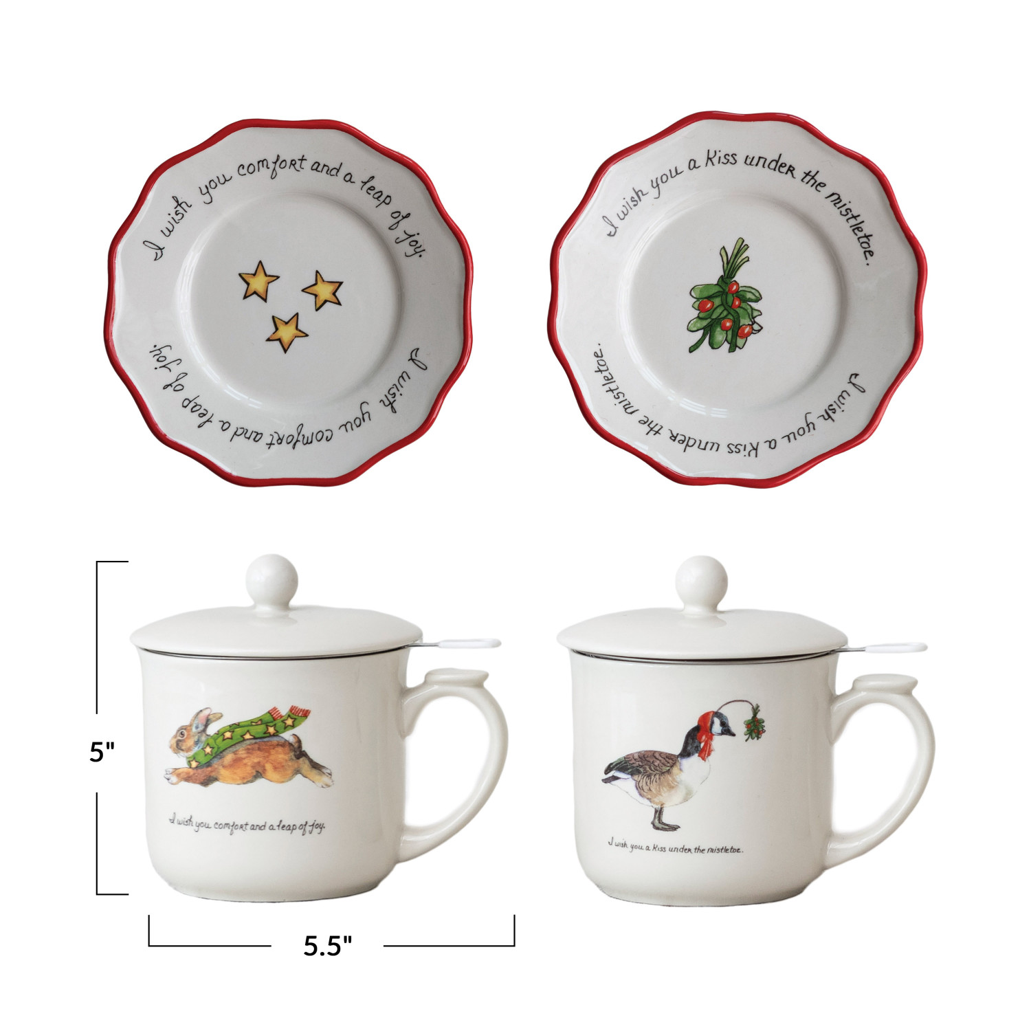 Catalog Name: 5-1/2" Round x 5"H 10 oz. Stoneware Mug & Saucer w/ Strainer, Lid, Animal & Wishes "I Wish You...", 2 Styles ©