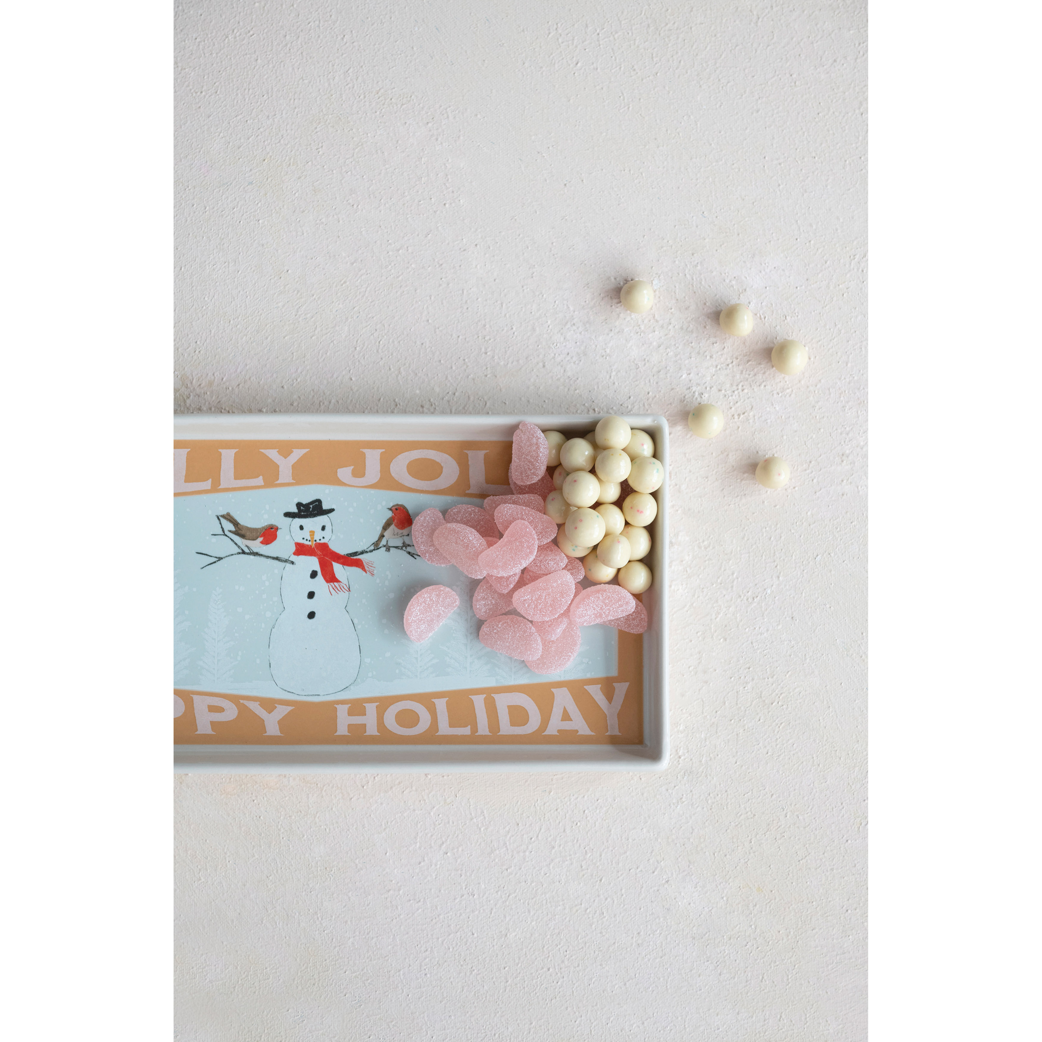 12-3/4"L x 6-1/2"W Stoneware Tray with Snowman "Holly Jolly Happy Holiday", Multi Color