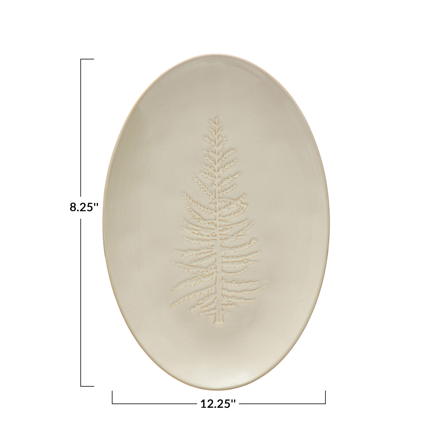 Catalog Name: 12-1/4"L x 8-1/4"W Oval Debossed Stoneware Platter w/ Tree, Reactive Glaze, White (Each One Will Vary)