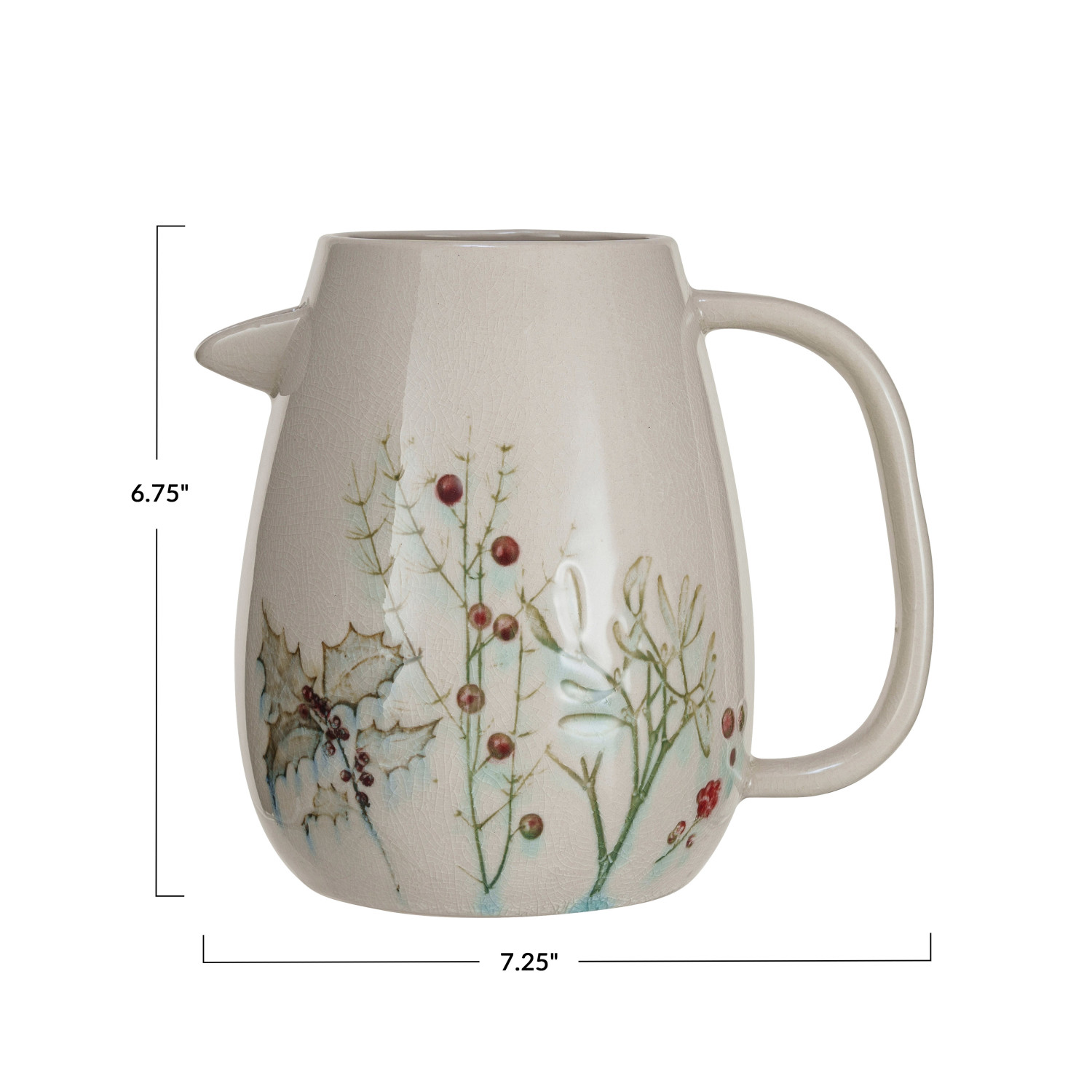 Catalog Name: 7-1/4"L x 5"W x 6-3/4"H 50 oz. Debossed Stoneware Pitcher w/ Seasonal Botanicals, Reactive Crackle Glaze, Multi Color (Each One Will Vary)
