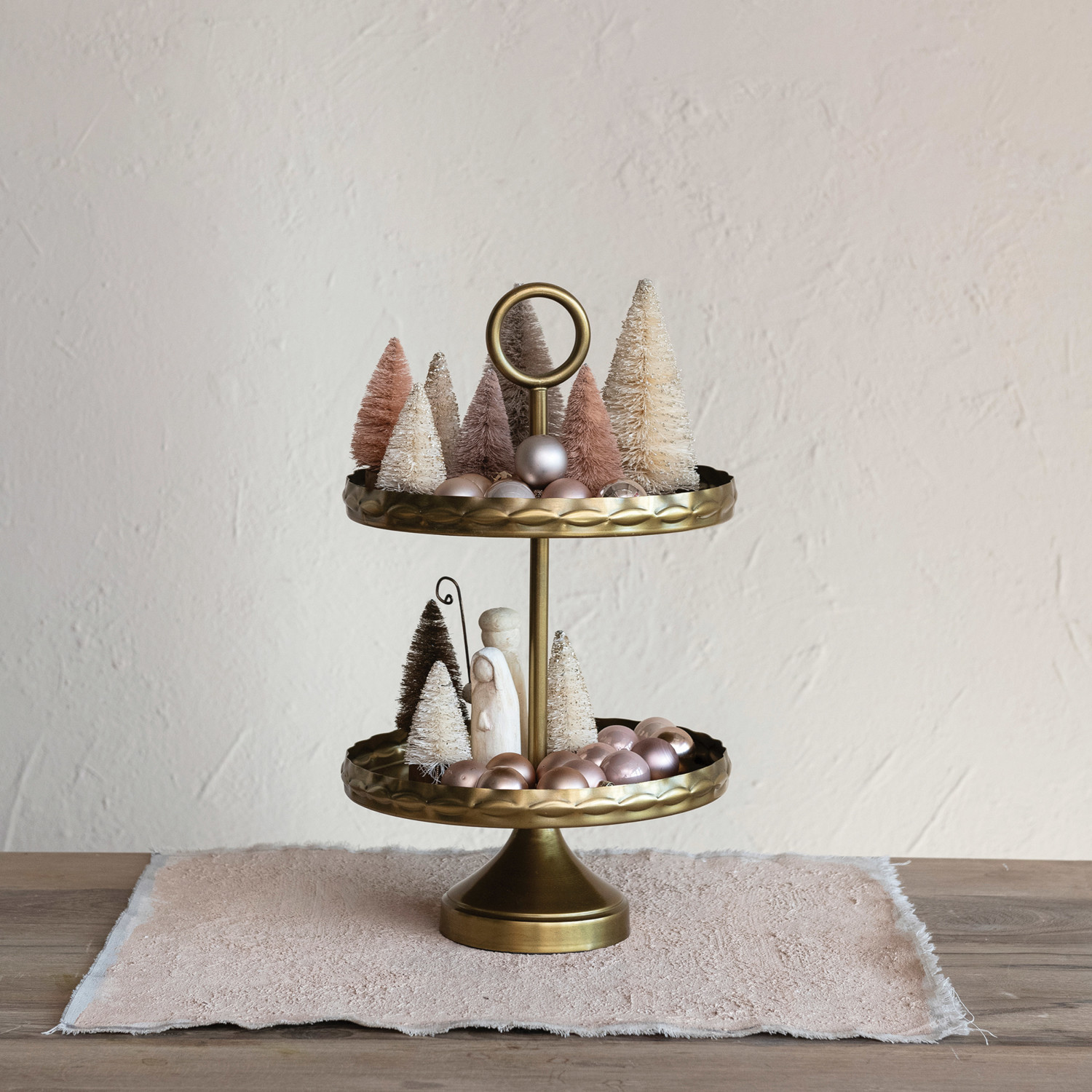 Catalog Name: 10-1/2" Round x 17"H Decorative Metal 2-Tier Tray w/ Embossed Edge & Brass Electroplating, KD