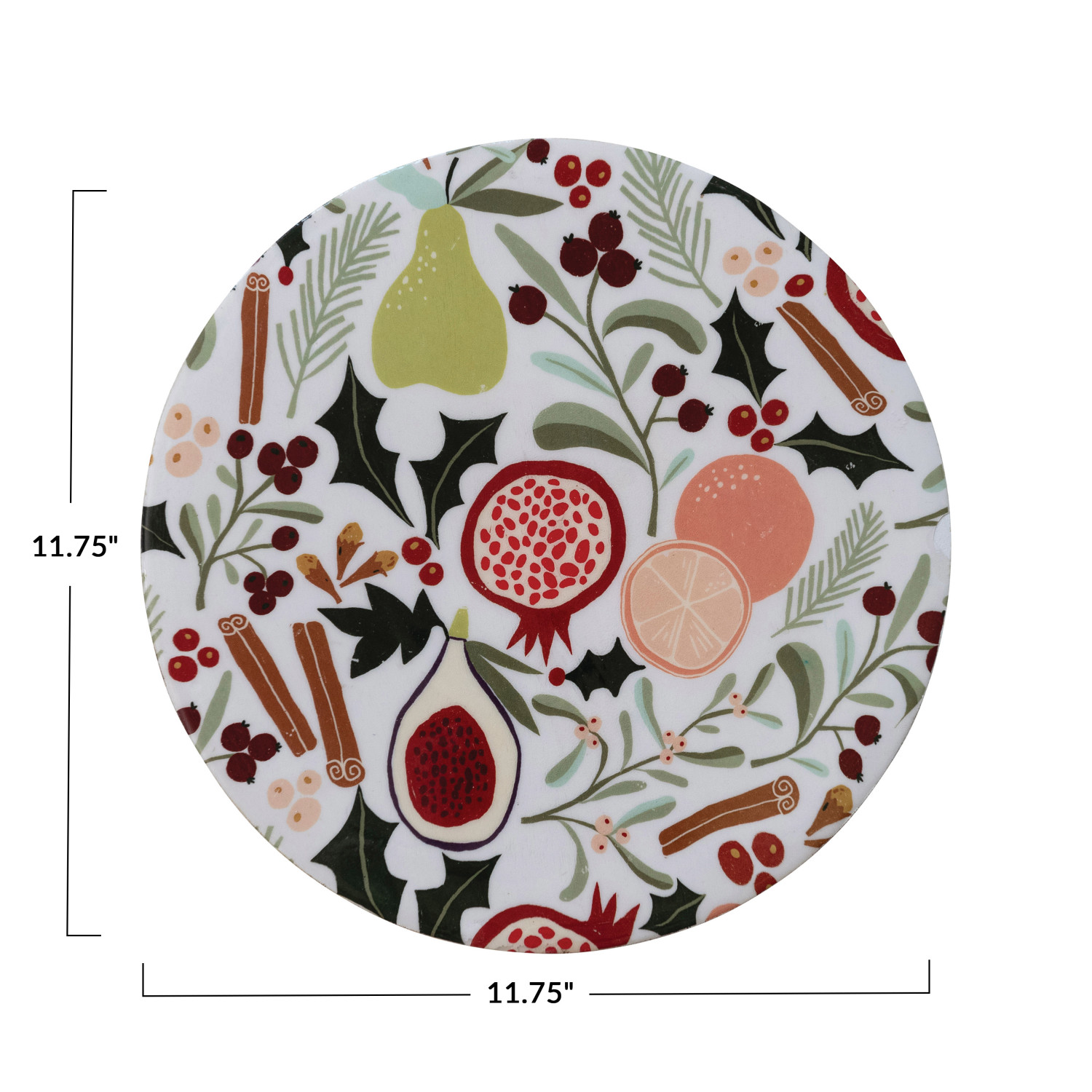 Catalog Name: 11-3/4" Round x 5-3/4"H Enameled Mango Wood Pedestal w/ Fruit & Botanicals Pattern, Multi Color ©