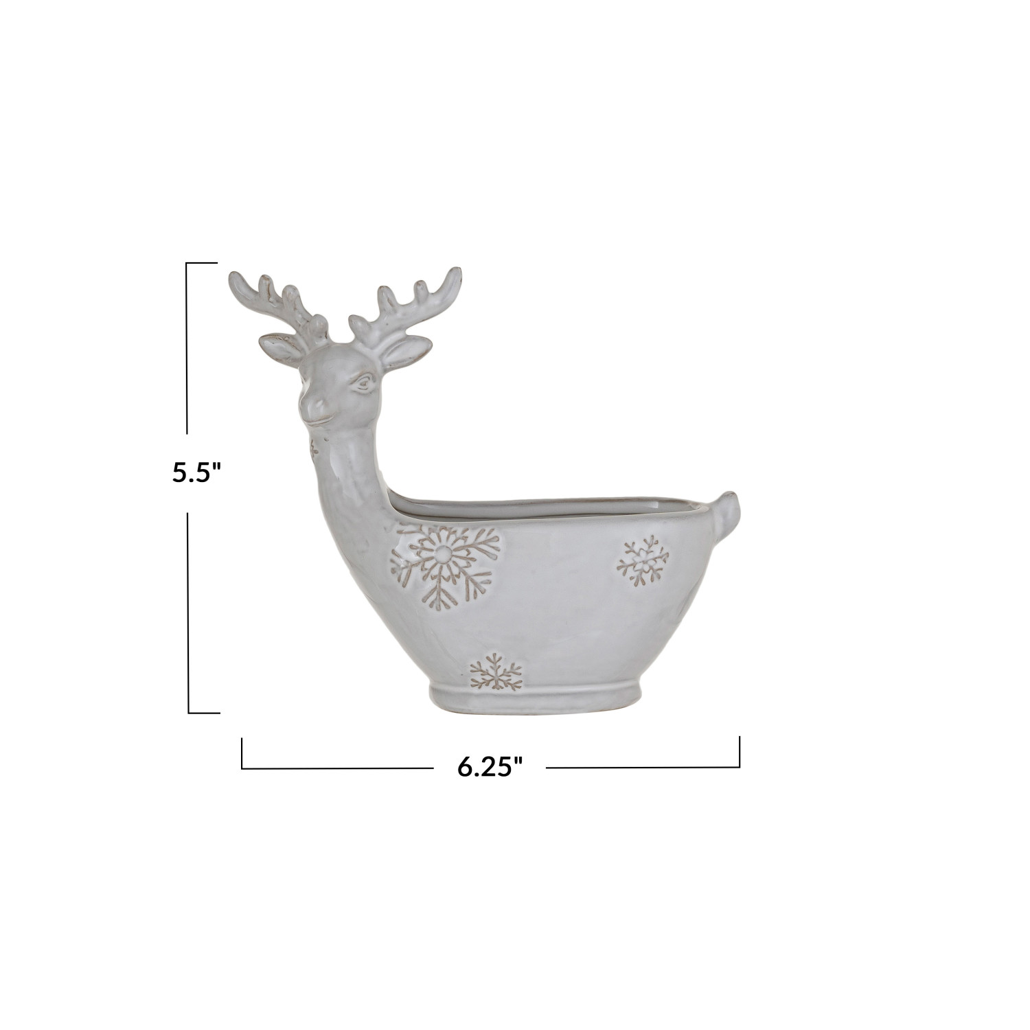 Catalog Name: 6-1/4"L x 2-3/4"W x 5-1/2"H Stoneware Deer Shaped Bowl w/ Snowflakes, Reactive Glaze, White (Each One Will Vary)