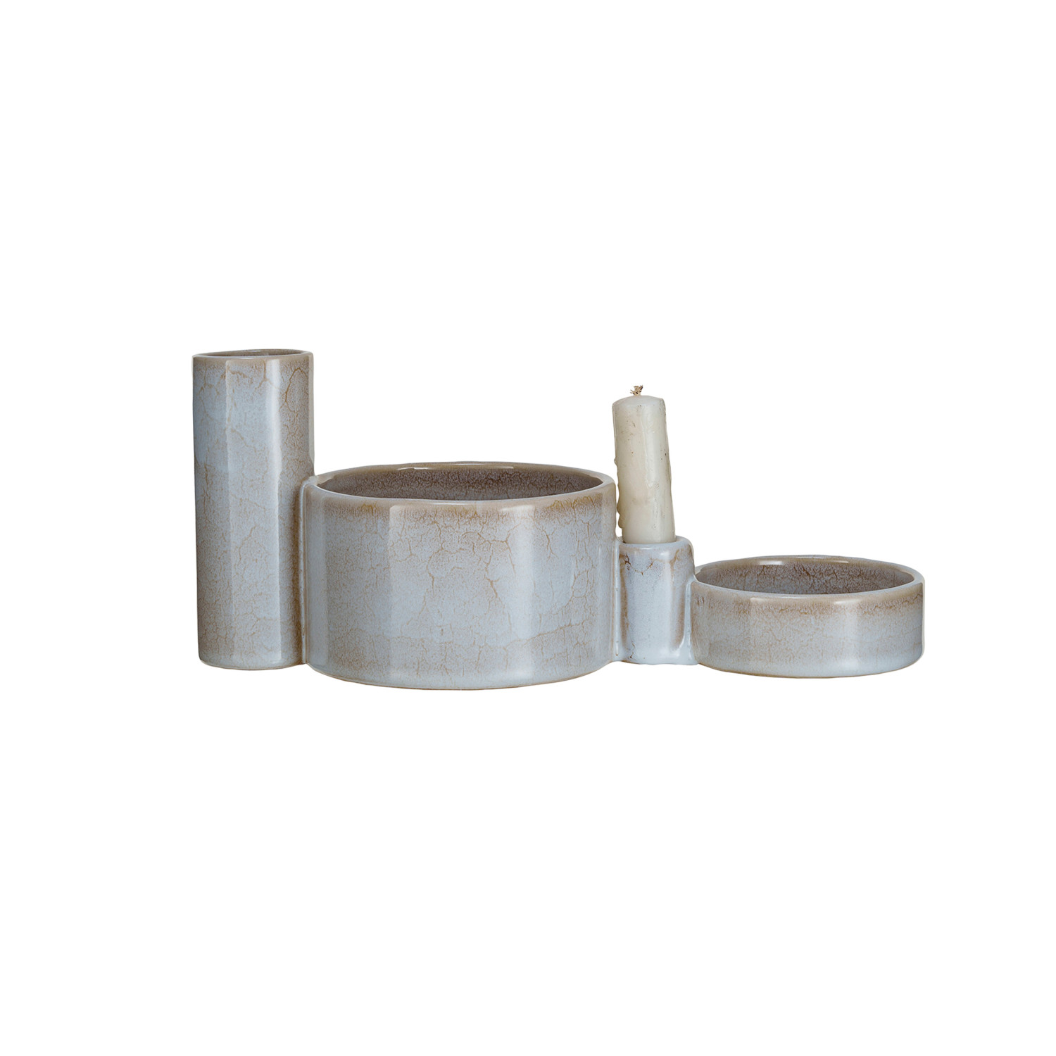 Catalog Name: 12"L x 5-1/4"W x 5-1/4"H Stoneware Serveware w/ 2" Round x 5-1/4"H Vase & 1-1/2" Round x 2"H Candle Holder, Reactive Glaze, White (Each One Will Vary)