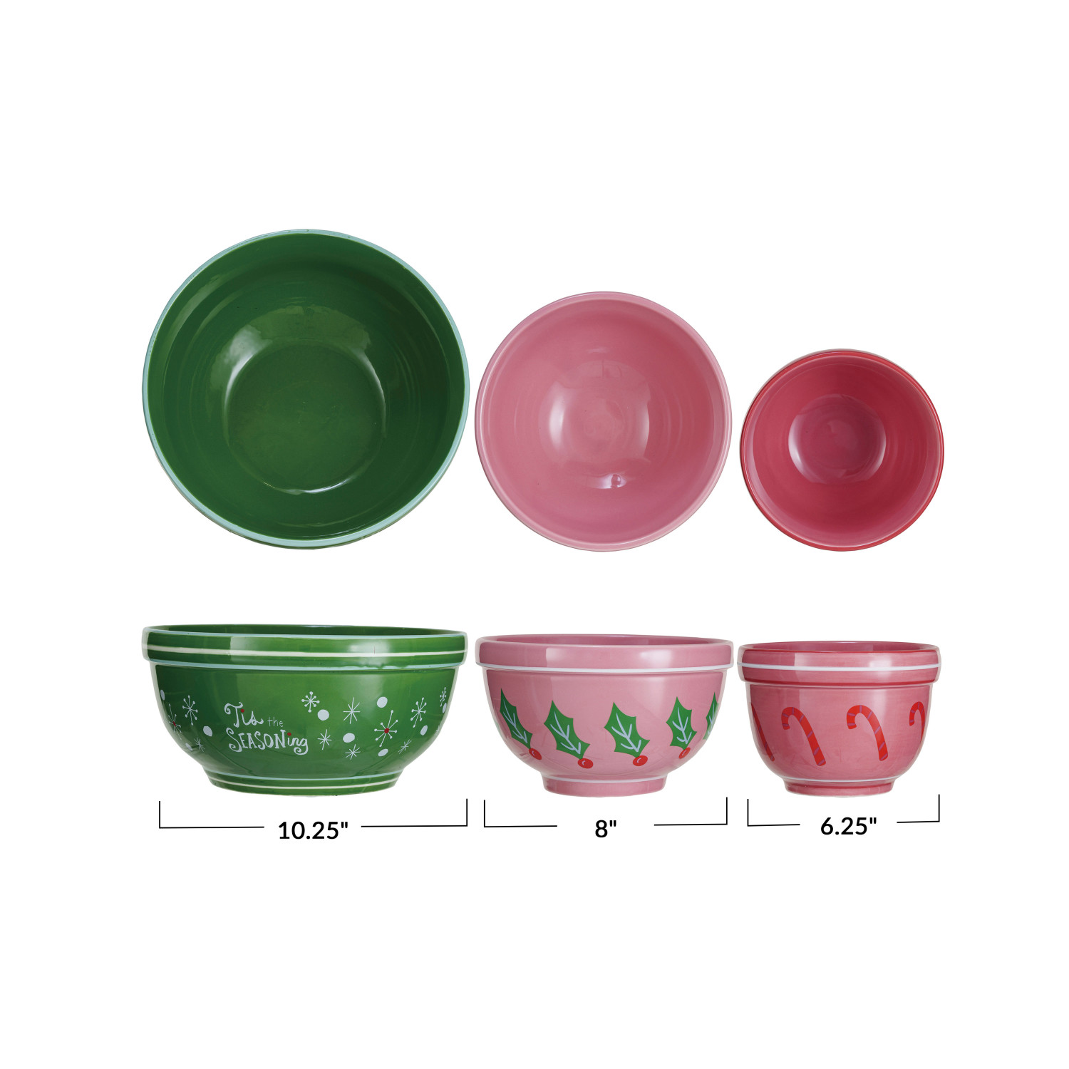 This "Tis the SEASONing" set of stoneware nesting bowls is a merry must-have for any holiday kitchen. The set includes three bowls, measuring 6.25 inches, 8 inches, and 10.25 inches in diameter, with respective heights of 4.5 inches, 4.75 inches, and 4.75 inches, offering 1 quart, 2 quarts, and 3.5 quarts of capacity. Each bowl is crafted from food-safe stoneware and features a vibrant, multi-colored holiday pattern that brings the joy of the season to any culinary creations. Whether used for mixing, serving, or storing, these bowls are as practical as they are festive. Hand washing is recommended to preserve their beauty and longevity. Celebrate the season with this functional and decorative addition to any holiday kitchenware. A set of 3 stoneware nesting bowls with a festive holiday pattern, perfect for seasonal cooking and serving. An ideal choice for those who love to add a splash of color and cheer to their kitchen during the holidays. This set includes bowls of varying sizes, making it versatile for mixing, serving, or storing.