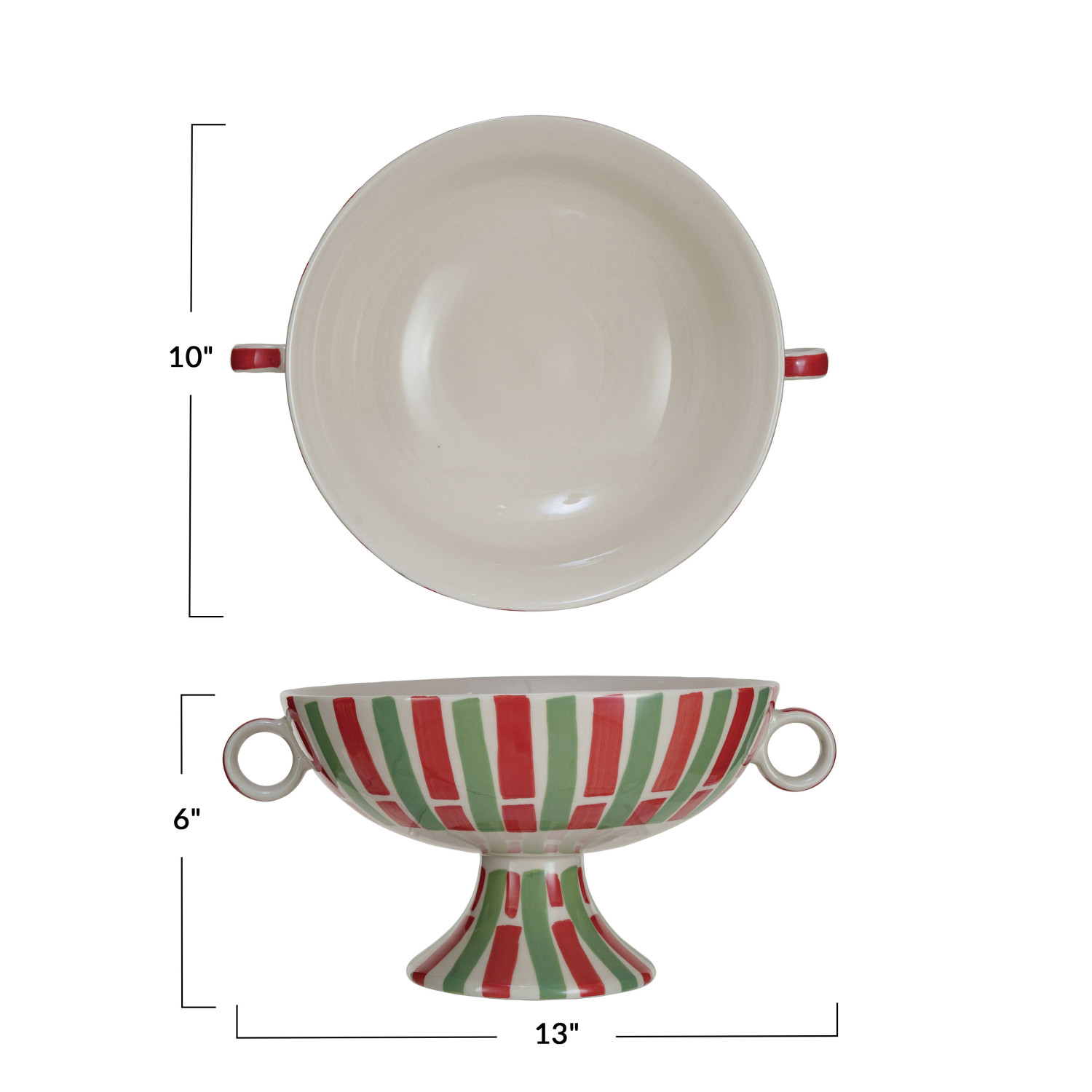 This festive footed bowl is a stunning piece that stands out with its hand-painted stripes and a trio of colors that embody the holiday spirit. Measuring 13 inches long, 10 inches wide, and 6 inches high, it's designed not only for function but also as a statement piece. The bowl's food-safe stoneware construction ensures it's ready for festive feasts, while the hand-wash recommendation will keep it looking splendid for seasons to come. Whether filled with seasonal fruits or serving a special dish, this bowl's presence on the table is sure to be a conversation starter. This bowl is a versatile addition to the serveware collection. A hand-painted stoneware bowl with graceful feet and festive stripes in red, green, and cream. An exquisite addition to holiday serveware, this bowl combines elegance with seasonal charm. This footed bowl with handles is perfect for a centerpiece or serving special holiday dishes.
