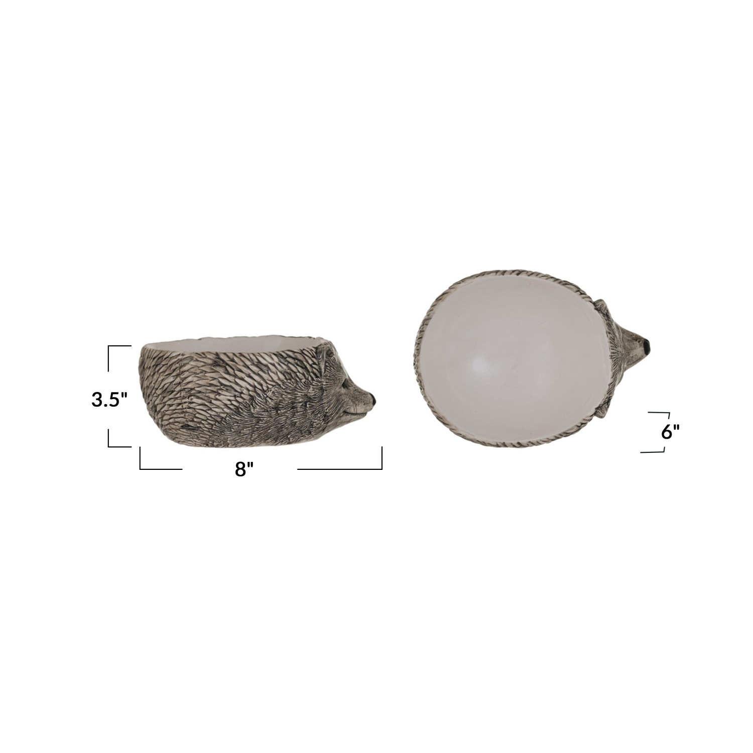 This whimsical hedgehog stoneware bowl is a delightful addition to any home, measuring 8 inches long, 6 inches wide, and 3.5 inches high. Its charming design features a hedgehog shape, complete with intricate details in a warm brown and cream color palette. Crafted from durable stoneware, it's a food-safe choice for serving or simply for decoration. The bowl's unique style makes it a conversation starter and a lovely gift for animal lovers or those who appreciate nature-inspired decor. Hand washing is recommended to preserve the hand-painted finish and ensure longevity. Whether used for dining or display, this hedgehog bowl is sure to bring a smile to face. A charming hedgehog-shaped bowl in earthy brown and cream tones, bringing a touch of nature to the table. An adorable accent piece that complements rustic and woodland-themed decor with ease. This bowl is not only a whimsical serving option but also a delightful decorative element for any space.