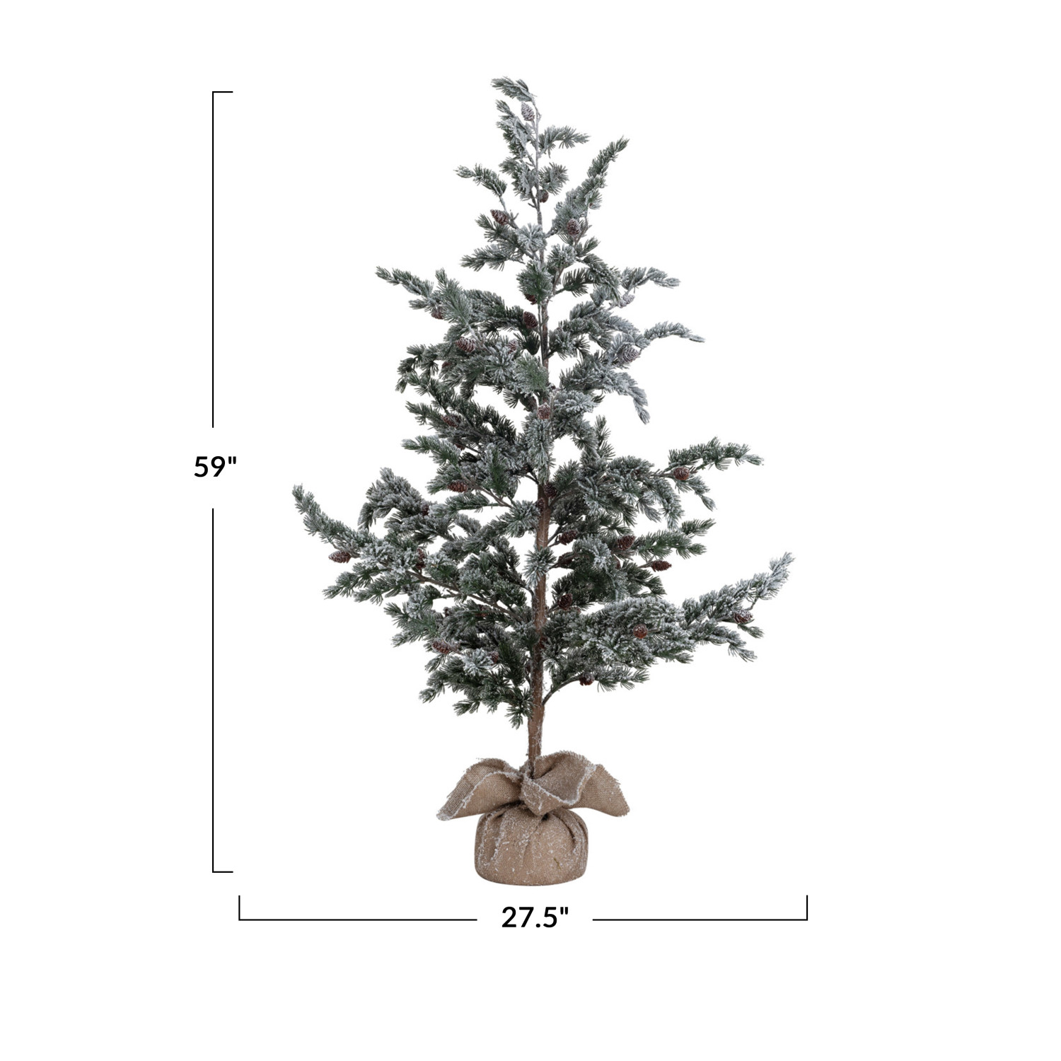 Catalog Name: 27-1/2" Round x 59"H Faux Evergreen Tree w/ Pinecones in Burlap Sack, Snow Finish, KD