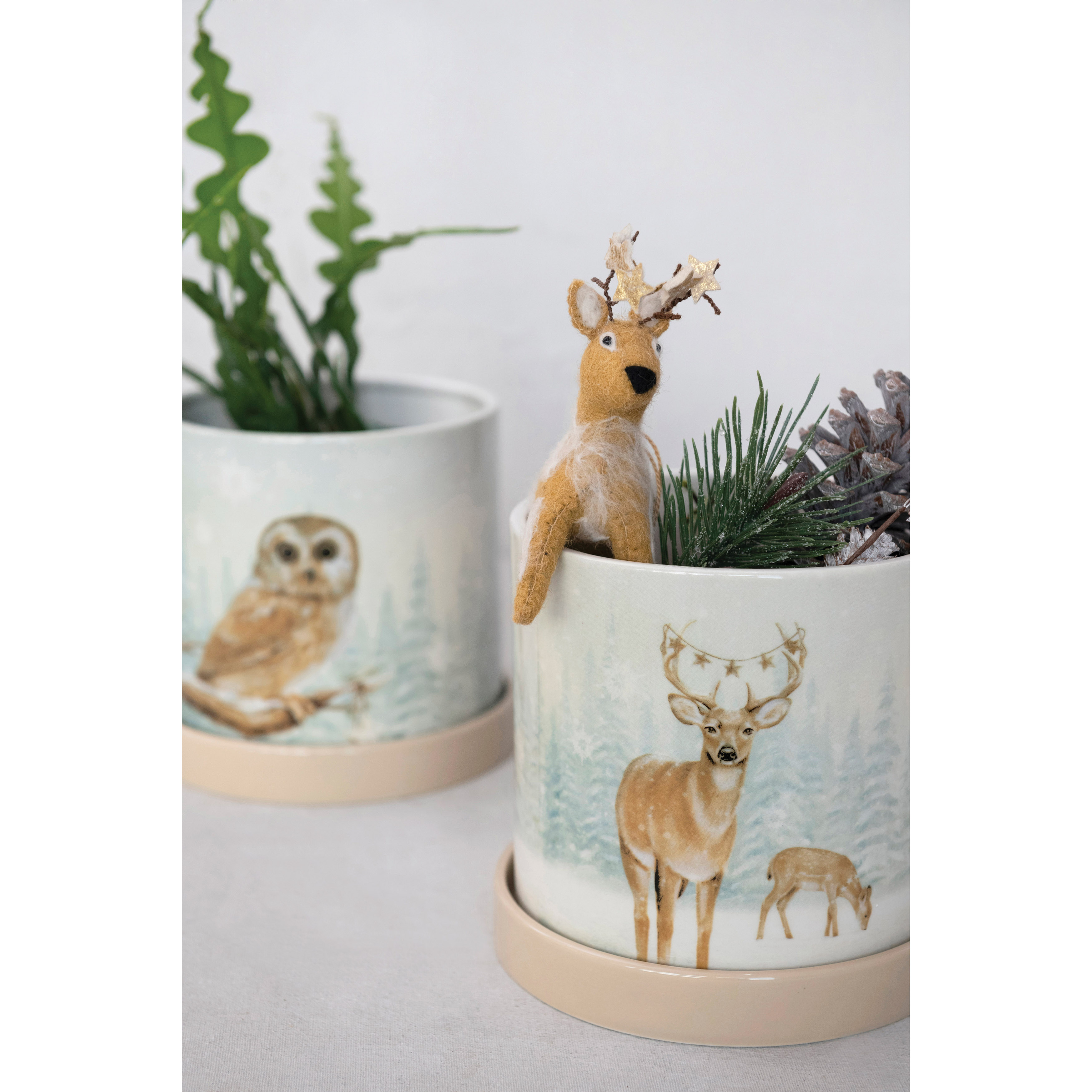 Stoneware Planter with Forest Animal and Saucer, Set of 2, 2 Styles