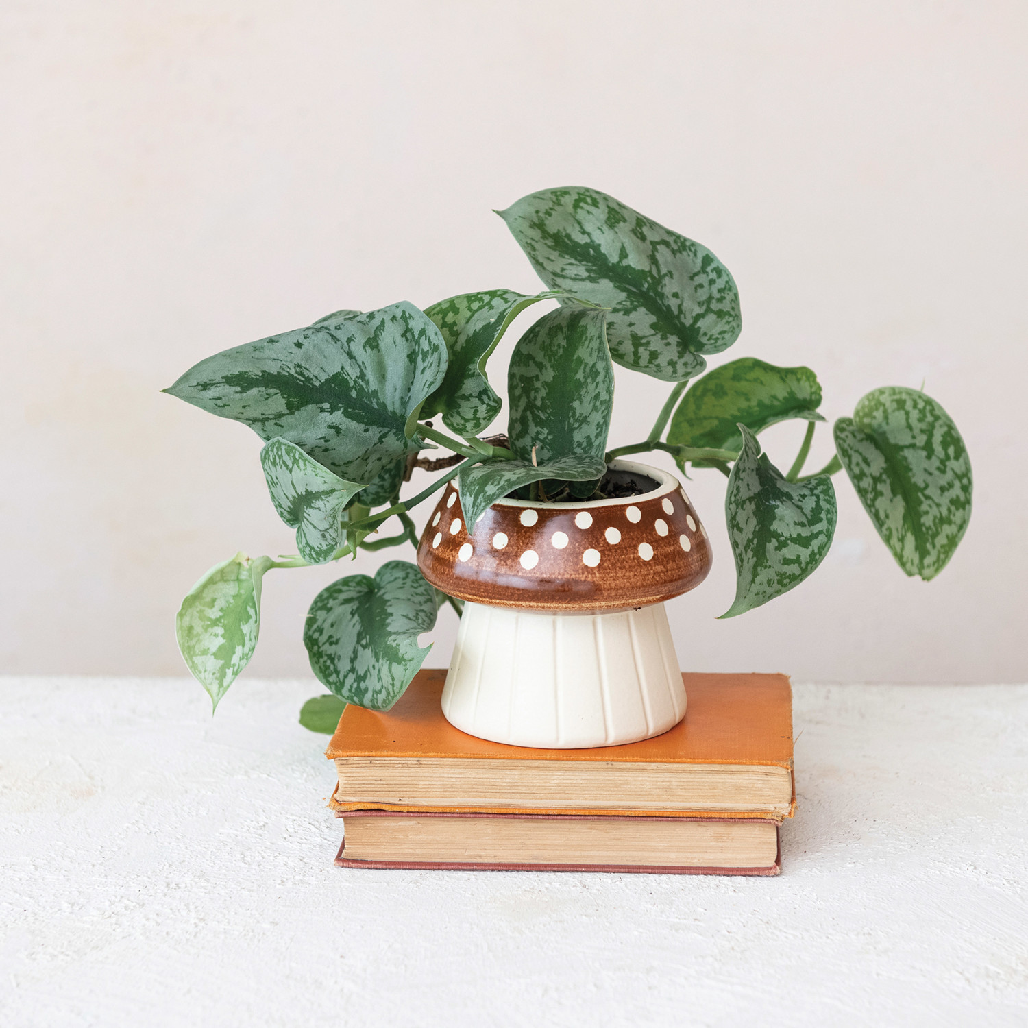 This mushroom stoneware planter captures the imagination with its charming design and earthy tones. The debossed detailing adds depth and texture, while the cream and brown colors evoke the natural beauty of woodland mushrooms. Its compact size is perfect for small plants, making it an ideal choice for those looking to add a touch of enchantment to their plant collection. The diameter is 5 inches, and the height is 4.25 inches. The stoneware construction ensures durability, and the easy-to-clean surface makes it a practical piece for everyday enjoyment. Whether nestled among garden plants or perched on a shelf, this planter will surely sprinkle a little magic into the surroundings. A whimsical cream and brown mushroom-shaped planter with a debossed design, perfect for adding a fairy-tale touch to any space. This planter is a delightful accent piece that brings a storybook charm to the home or garden. Suitable for small plants or succulents, it's a magical way to display any greenery.