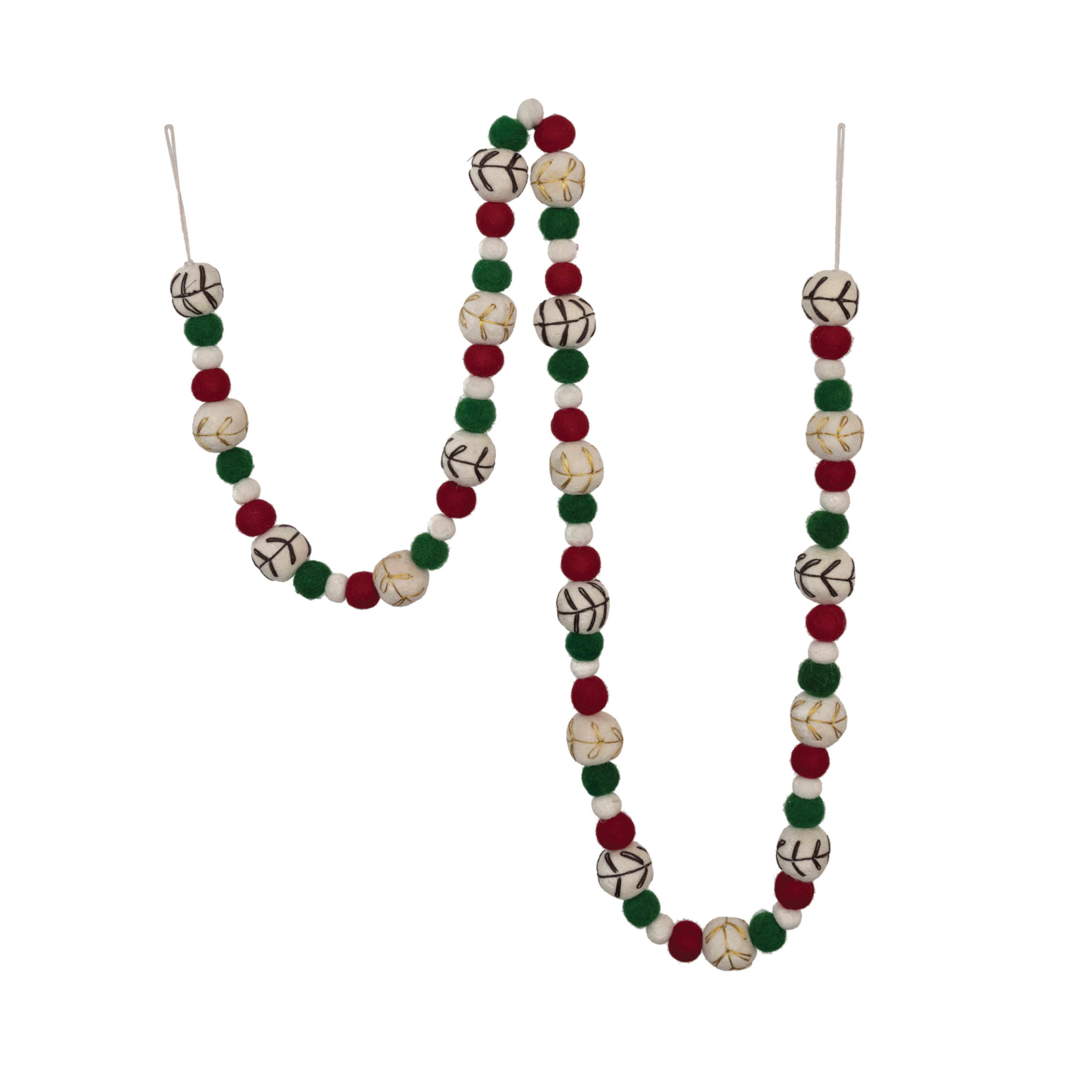 Catalog Name: 72"L x 1-1/2"H Handmade Wool Felt Ball Garland w/ Embroidery, Natural, Red & Green