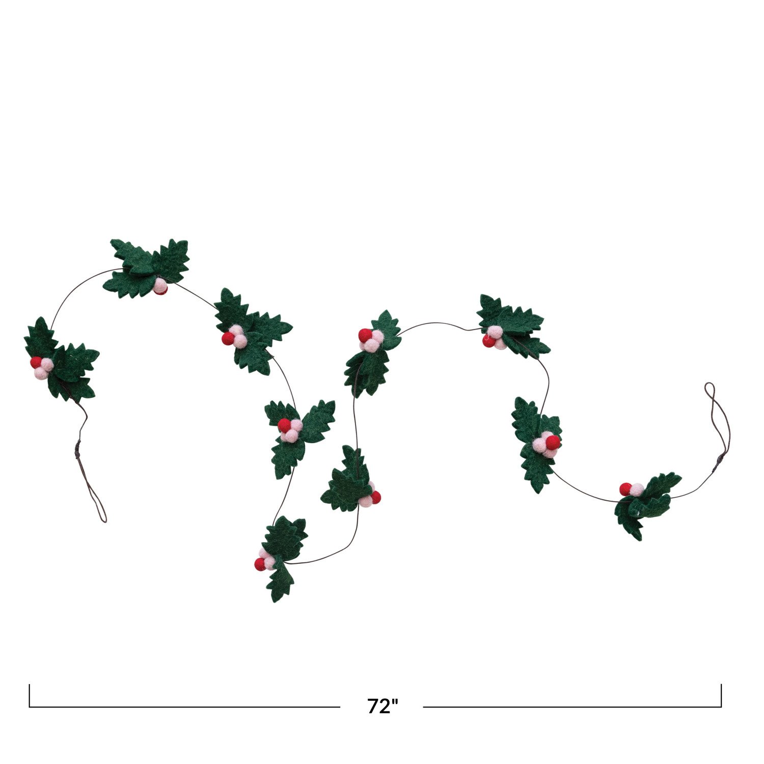 This whimsical garland features delicately handcrafted wool felt leaves and berries strung together with a wired cord. Add a touch of festive whimsy to any space with our enchanting collection of garlands, including stunning glass, sleek metal, and delightfully plush options, all expertly crafted to create a merry and bright atmosphere.