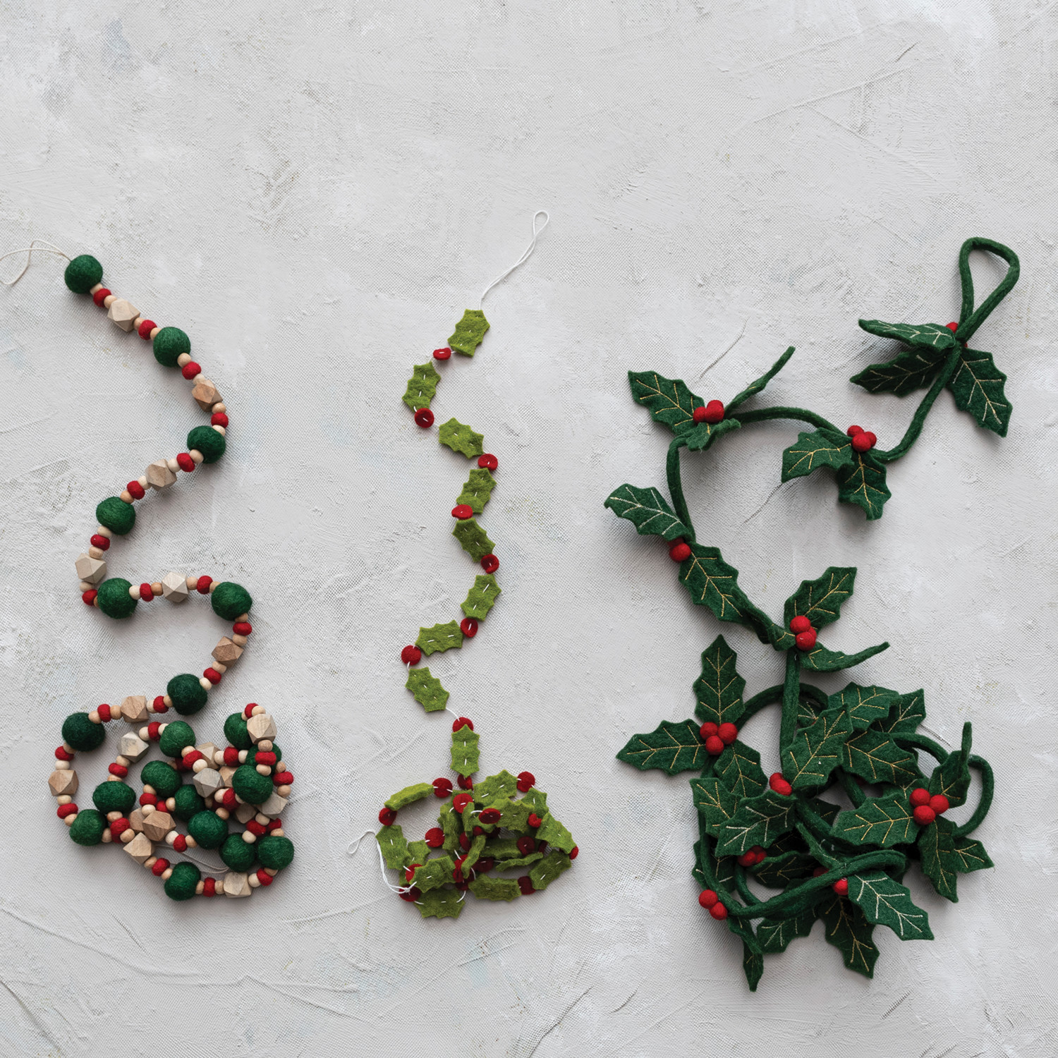 This whimsical garland features delicately handcrafted wool felt holly leaves and berries finished with gold embroidery. Add a touch of festive whimsy to any space with our enchanting collection of garlands, including stunning glass, sleek metal, and delightfully plush options, all expertly crafted to create a merry and bright atmosphere.