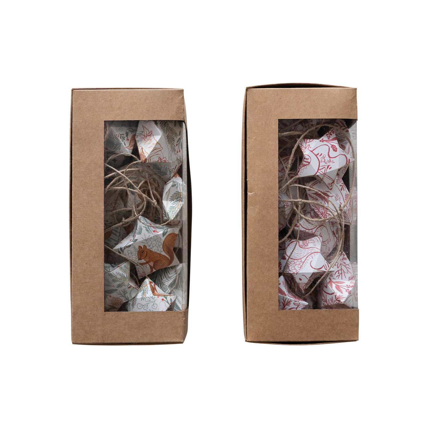 This printed paper star garland set is a festive and charming way to decorate the home. The garland features a colorful and whimsical pattern of flowers, leaves, animals, and stars, in two styles each with its own personality and appeal. The garland is made of high-quality paper and jute that are lightweight and durable, and can be stored and reused easily. The garland measures 72 inches in length, 7 inches in height, and comes in a kraft box for easy packaging and gifting. Use it for holidays, parties, or everyday occasions, as this garland will add some fun and flair to the space. A festive and charming printed paper star garland with woodland flora and fauna pattern in kraft box. A lovely way to decorate the home, as it features a colorful and whimsical pattern of flowers, leaves, animals, and stars, in two styles. Ideal for hanging on walls, windows, doors, mantels, or trees, as it adds some fun and flair to the space.