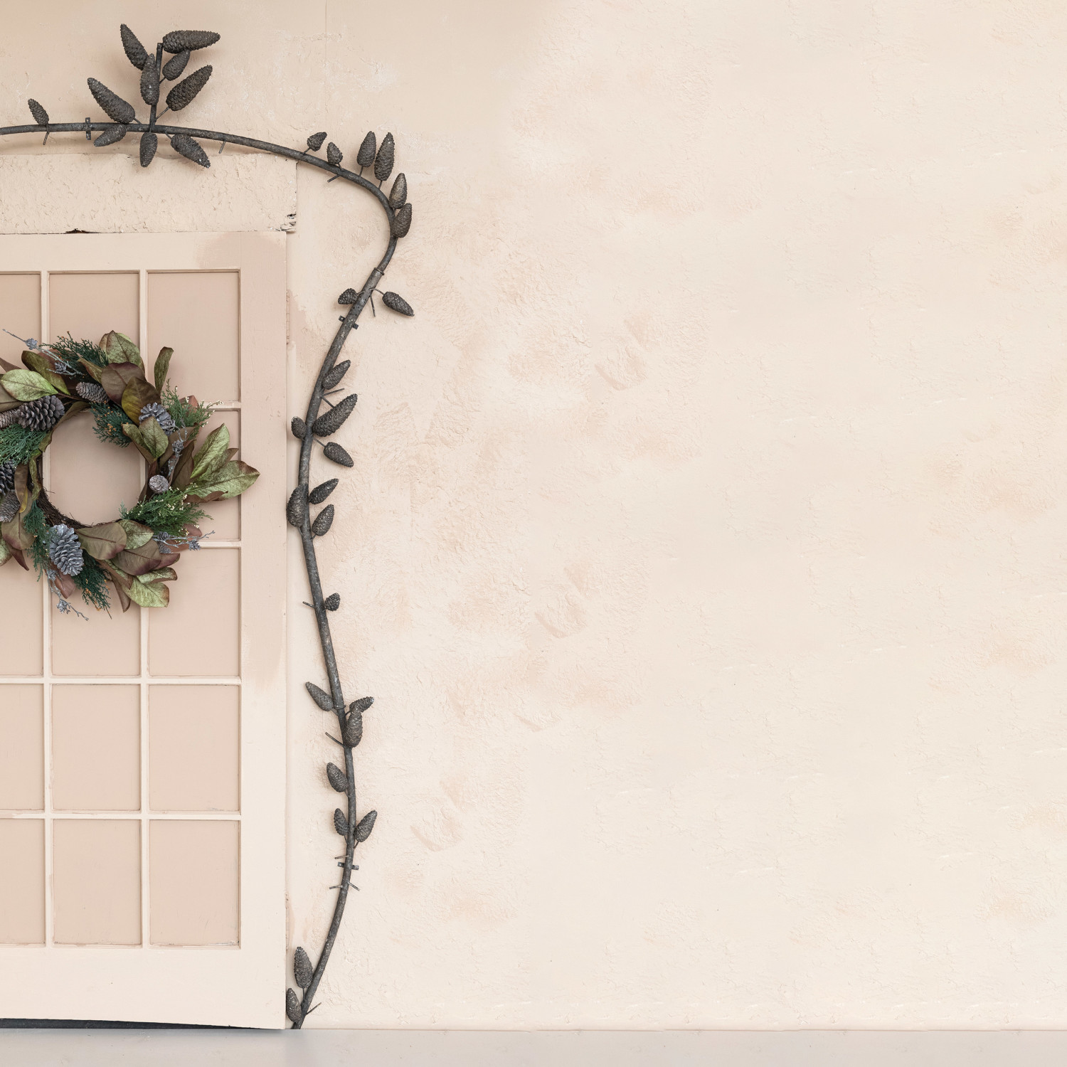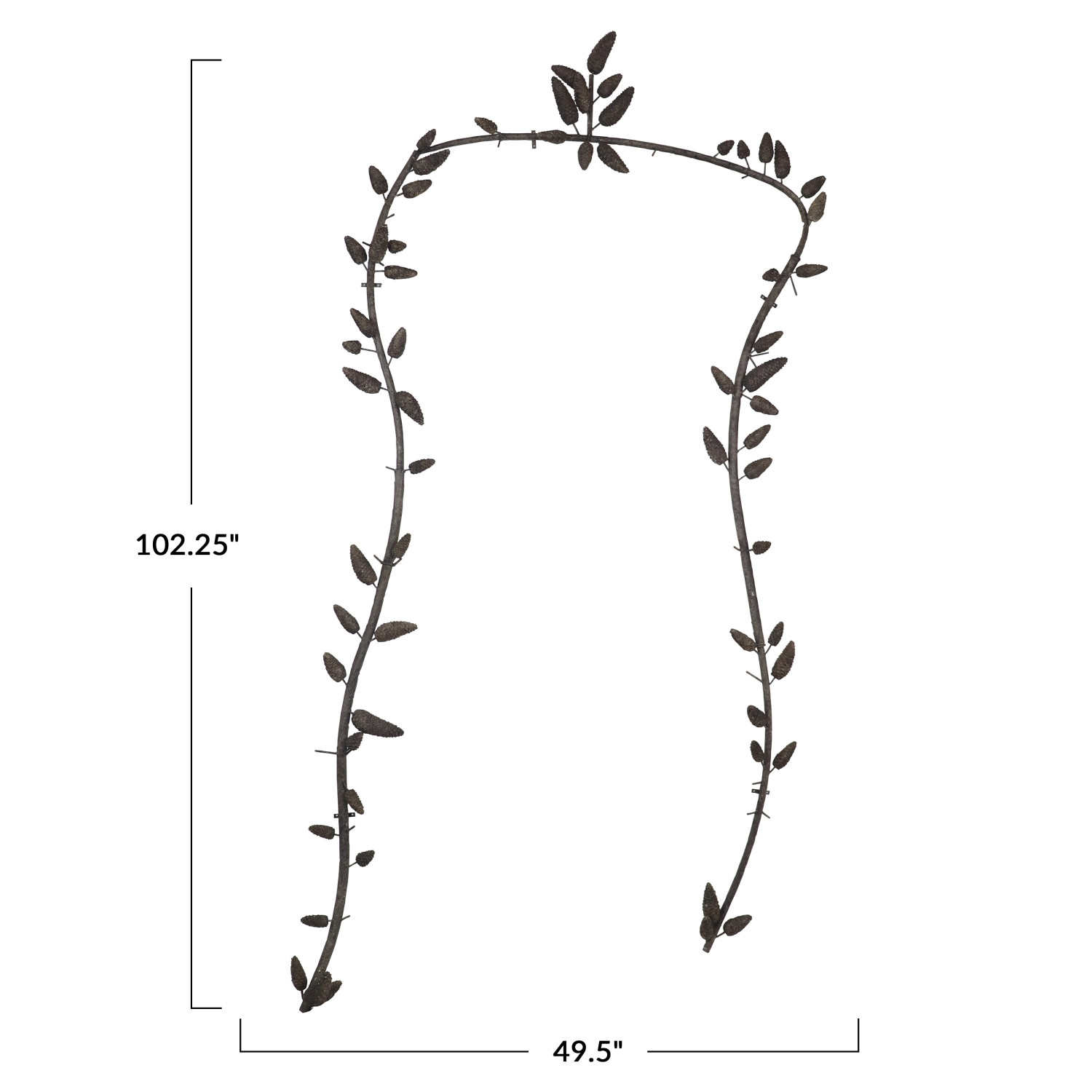 Catalog Name: 49-1/2"W x 102-1/4"H Metal & Resin Hanging Wall Arch w/ Faux Pinecones, Distressed Bronze Finish, KD, Truck Ship