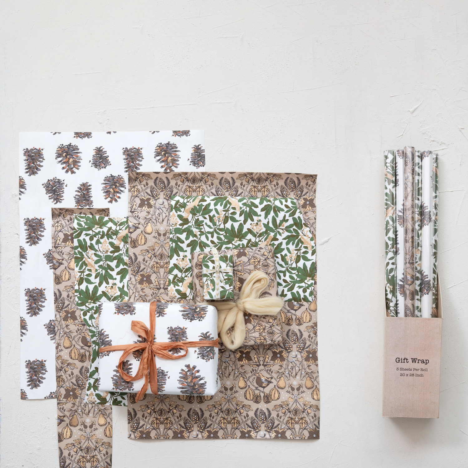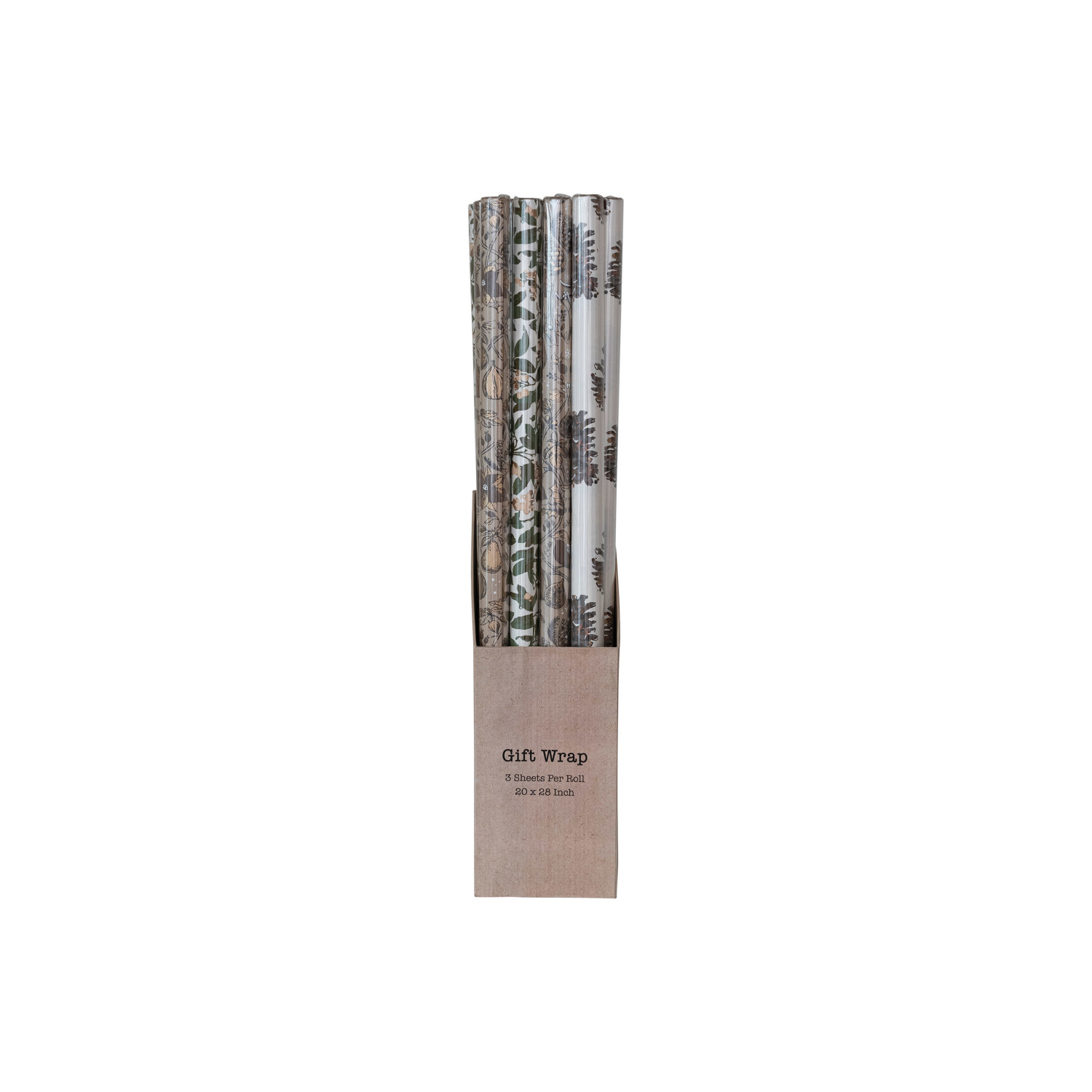 Catalog Name: 28"L x 20"W Handmade Printed Recycled Wrapping Paper Sheets w/ Patterns, Multi Color, 3 Styles, Set of 12 Rolls in Kraft Display Box (3 Sheets Per Roll, 4 Rolls Per Style)