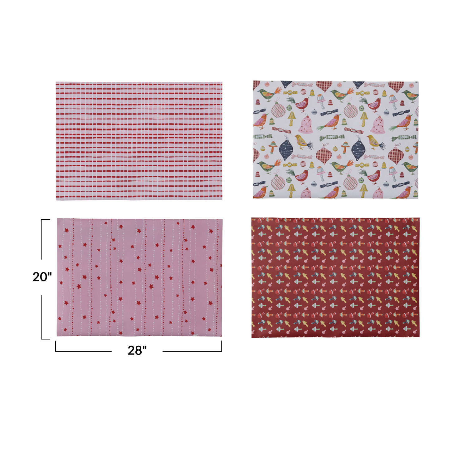 This set of wrapping paper is a treasure trove of holiday spirit, featuring four distinct styles that capture the essence of the season's icons. Each style contains 3 sheets, amounting to 12 sheets in total, all housed in an attractive kraft display box that's as functional as it is stylish. The multi-colored patterns range from classic holiday motifs to contemporary designs, providing a versatile selection to adorn gifts. Whether wrapping a tiny trinket or a grand gesture, the dimensions of 28 inches in length and 20 inches in width ensures plenty of paper to work with, making the act of wrapping as enjoyable as the act of giving. Celebrate the holidays with a flourish of color and a parade of patterns with this delightful wrapping paper collection. A dazzling ensemble of wrapping sheets, each bursting with iconic holiday patterns in a symphony of colors. An ideal accent for any festive gift, these papers are designed to harmonize with the joyful spirit of the season. Ideal for all holiday wrapping needs, these papers also serve beautifully in seasonal crafts and decorations.