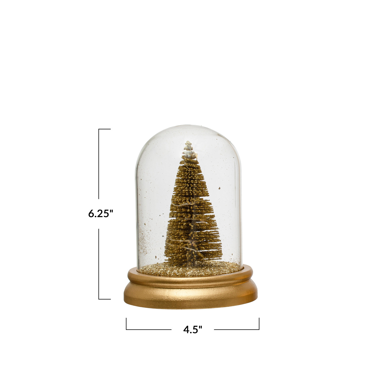 Catalog Name: 4-1/2" Round x 6-1/4"H Glass Cloche w/ Bottle Brush Tree, MDF Base, 5 LED Lights & Glitter, Gold Color (Batteries Included)