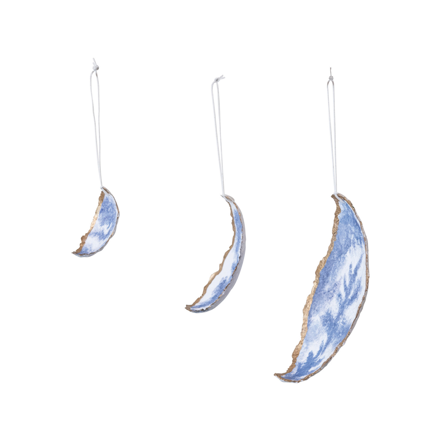 This set of ornaments is shaped like oyster shells. They are handmade and each one is different. They have blue, white, and gold colors. Hang them up with the string they come with. They are made of a cotton blend. The smallest one is 2.5 inches high, and the biggest one is 6 inches high. These ornaments can make any place look more special. This is a perfect choice for anyone who loves graceful and elegant home decor. These beautiful handmade paper mache ornaments come in a set of 3 and are shaped like oyster shells. Each ornament is hand-painted in a combination of blue, white, and gold for a unique and coastal look. Perfect for adding a touch of the beach to the holiday décor or year-round coastal charm.