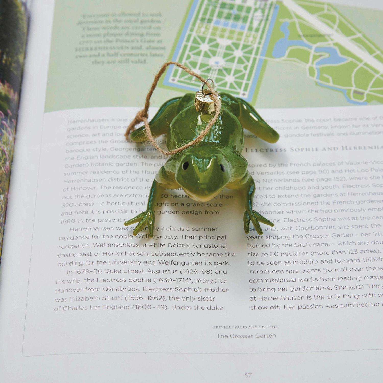 This ornament is a small work of art, capturing the essence of a frog in mid-leap. Hand-painted in a vivid green, the glass captures the amphibian's natural vibrancy. It dangles from a string, ready to add a touch of whimsy to any setting. At 4 inches long and 2 inches high, it's the perfect size to stand out while complementing the rest of the decor. Whether it's peeking out from between the leaves of the tree or sitting on a shelf, this frog ornament is sure to charm and delight. This is a perfect choice for anyone who loves whimsical and adorable holiday decor. A hand-painted glass frog ornament, vibrant in green, poised as if ready to leap off the branch. An ornament that brings a splash of the outdoors to any festive decor with its lively green hue and detailed artistry. Perfect for adding a pop of color to a Christmas tree or as a charming accent in a garden-themed room.