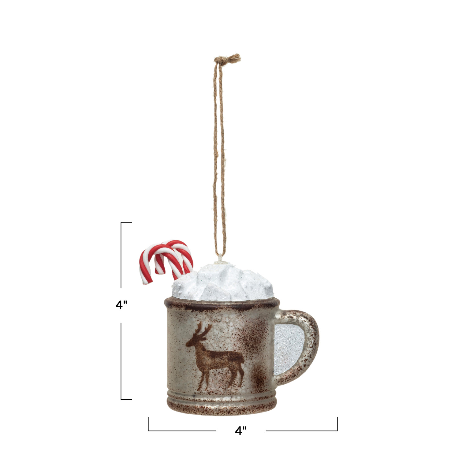 Catalog Name: 4"L x 2-1/2"W x 4"H Glass Mug Ornament w/ Candy Cane & Deer, Multi Color