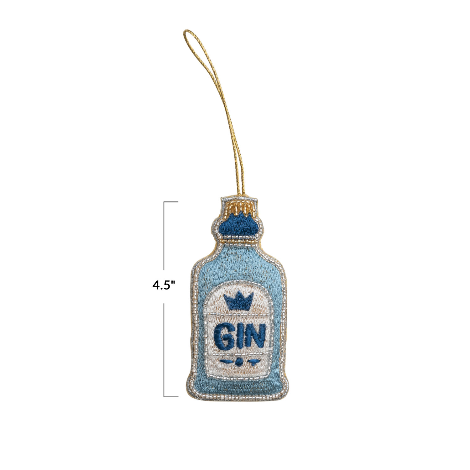 This playful fabric ornament features the silhouette of a gin bottle finished with masterful embroidery and beadwork. Ornaments can be showcased as decorations on a Christmas tree, wreath, or atop a festive centerpiece, hung from doorways, displayed on mantels, used to embellish cards and presents, or given as gifts.