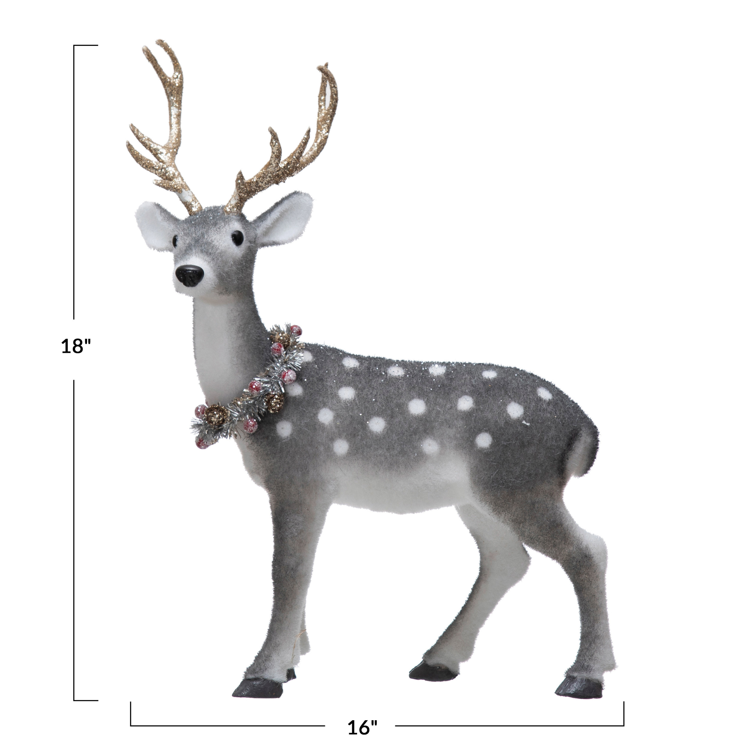 This furry friend is an adorable addition to any festive home. Made out of flocked foam, this standing deer has a beautiful grey color with a glitter finish. This forest friend is perfect for animal-lovers to place on display in the holiday season for a winter-wonderland themed home.