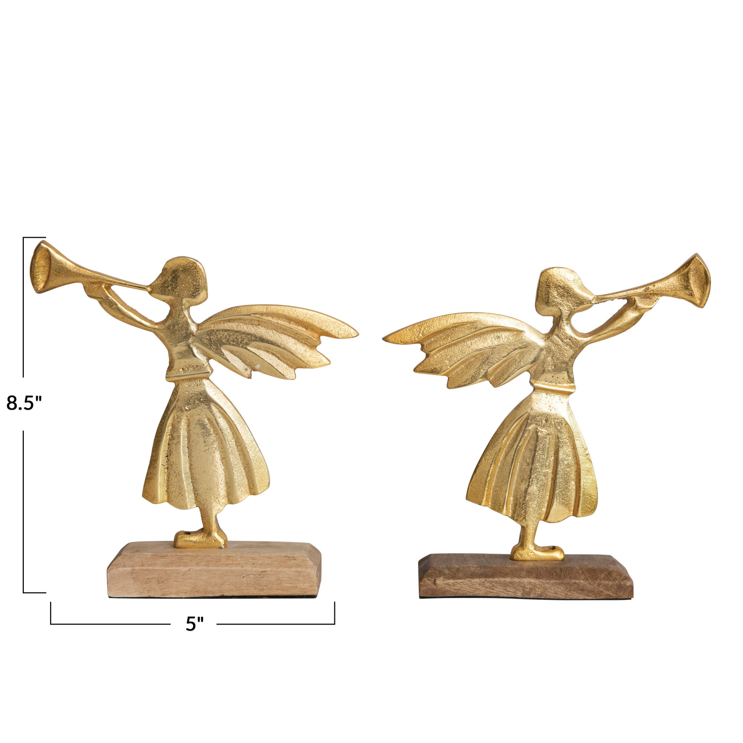 5"L x 2"W x 8-1/2"H Cast Aluminum Angels on Mango Wood Bases, Gold Finish & Natural, Set of 2