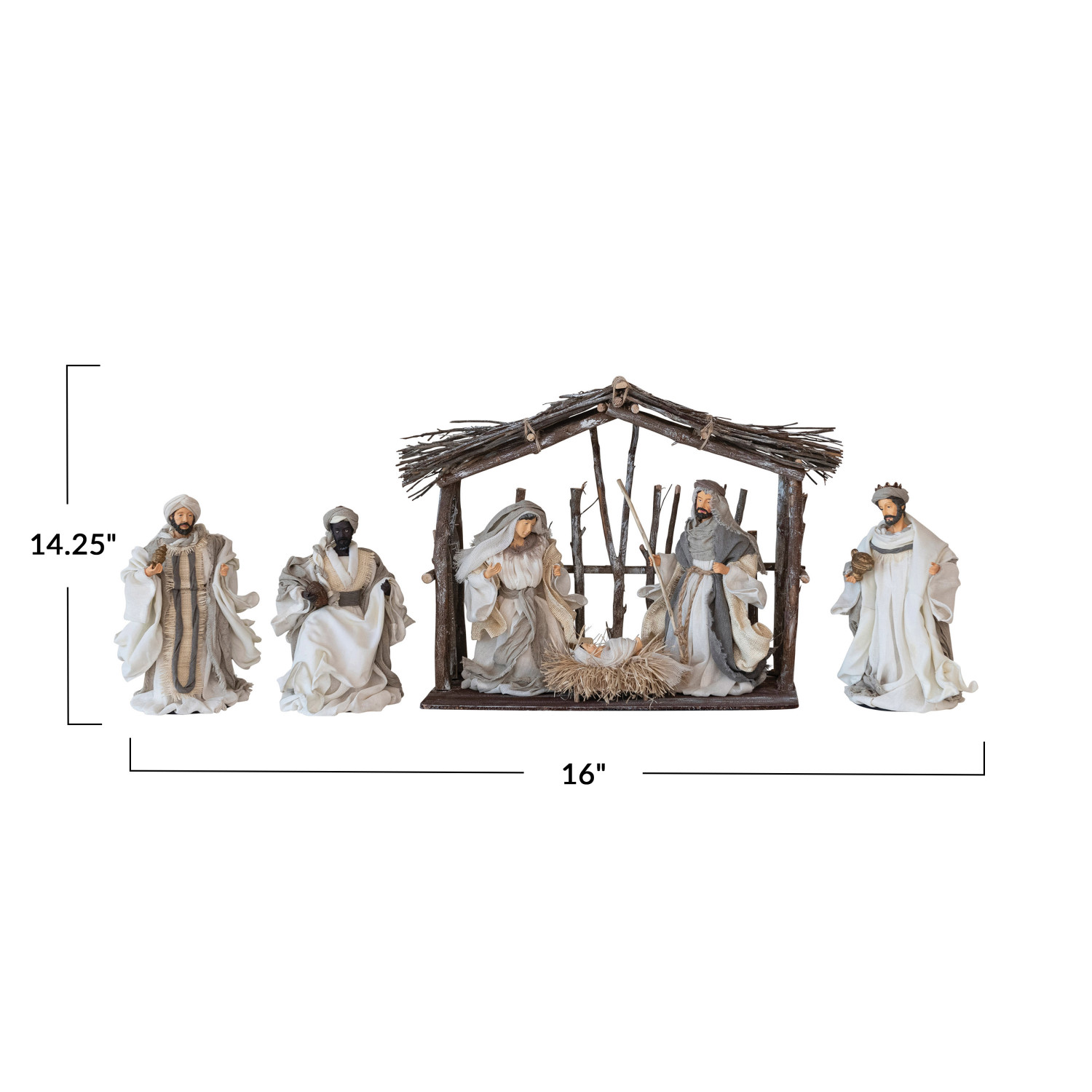 This multicolor fabric and resin nativity with stable is a beautiful and convenient way to decorate the home. It features a fabric and resin nativity with a multicolor design and a stable made of twigs that gives it a cozy and festive look, making it look like a real nativity scene. The nativity includes 6 figures: Mary, Joseph, baby Jesus, three wise men, and the stable. The nativity has a smooth and detailed texture that is pleasant to touch and look at. The Nativity is a lovely and meaningful piece that can match any style, from traditional to eclectic. It is ideal for celebrating the Christmas season and the birth of Jesus, where it can create a peaceful and sacred atmosphere. The nativity is made of a cotton blend, resin, and twigs that are durable, lightweight, and easy to clean. The whole set measures 16 inches in length, 8.5 inches in width, and 14.25 inches in height, making it a noticeable and attractive accessory. This multicolor fabric and resin nativity with stable, set of 7, is a perfect choice for anyone who loves cozy and festive home decor. A fabric and resin nativity with a multicolor design and a stable made of twigs that gives it a cozy and festive look. A lovely and meaningful piece that can match any style, from traditional to eclectic. Ideal for celebrating the Christmas season and the birth of Jesus, this nativity can be displayed on a mantel, a table, or a shelf.