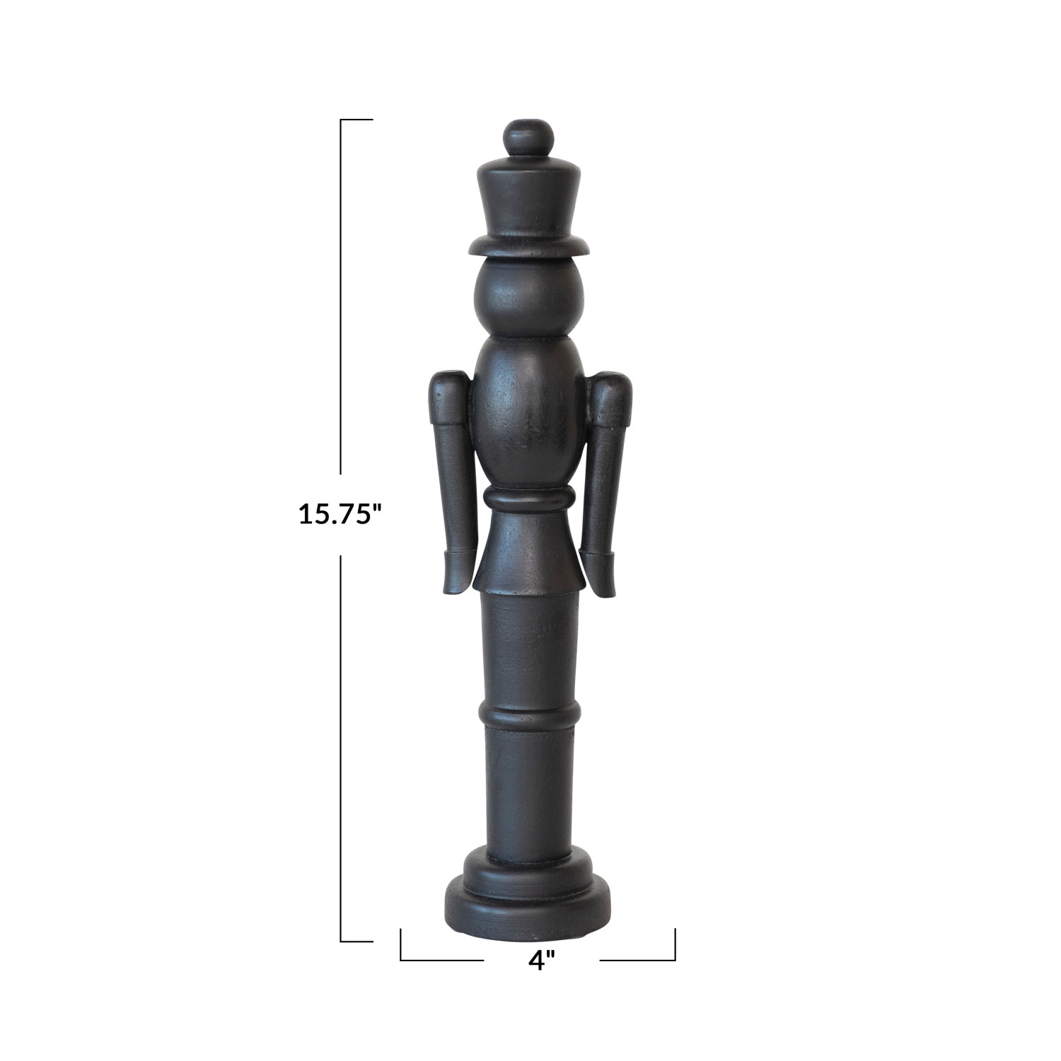 This black mango wood nutcracker is a beautiful and convenient way to decorate the home. It features a mango wood nutcracker with a black color that gives it a sleek and elegant look, making it look like a real nutcracker. The nutcracker has a smooth and detailed texture that is pleasant to touch and look at. The nutcracker is a stunning and classy piece that can elevate any style, from traditional to modern. It is ideal for celebrating the Christmas season and the Nutcracker ballet, where it can add a touch of magic and sophistication to the space. The nutcracker is made of mango wood, which is durable and natural, making it a great choice for home decoration. It measures 4 inches in diameter and 15.75 inches in height, making it a noticeable and attractive accessory. This is a perfect choice for anyone who loves sleek and elegant home decor.