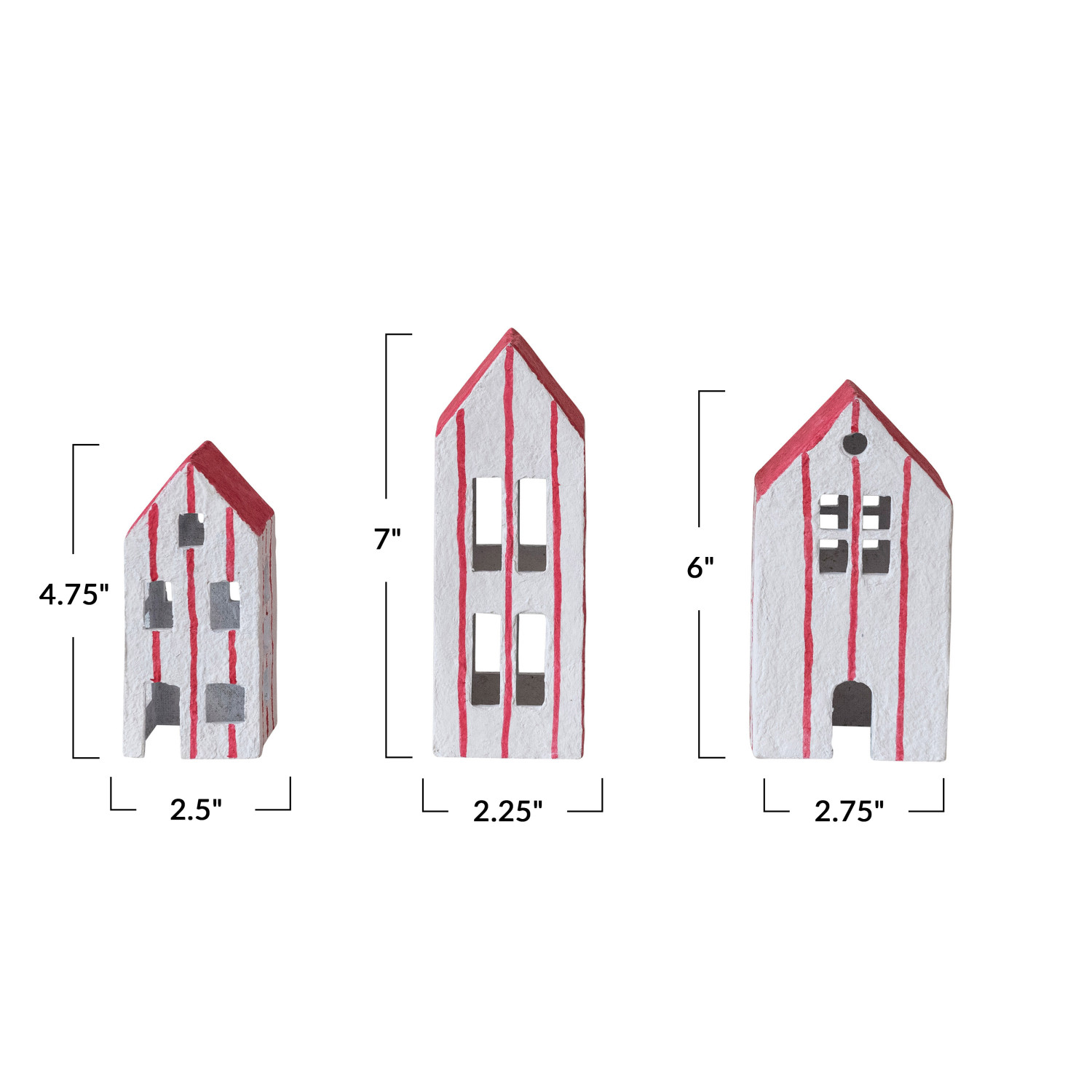 Catalog Name: 3"L x 2-3/4"W x 6"H, 2-3/4"L x 2-1/2"W x 7"H & 2-1/2"L x 2-1/4"W x 4-3/4"H Hand-Painted Paper Mache Houses, White & Red, Set of 3