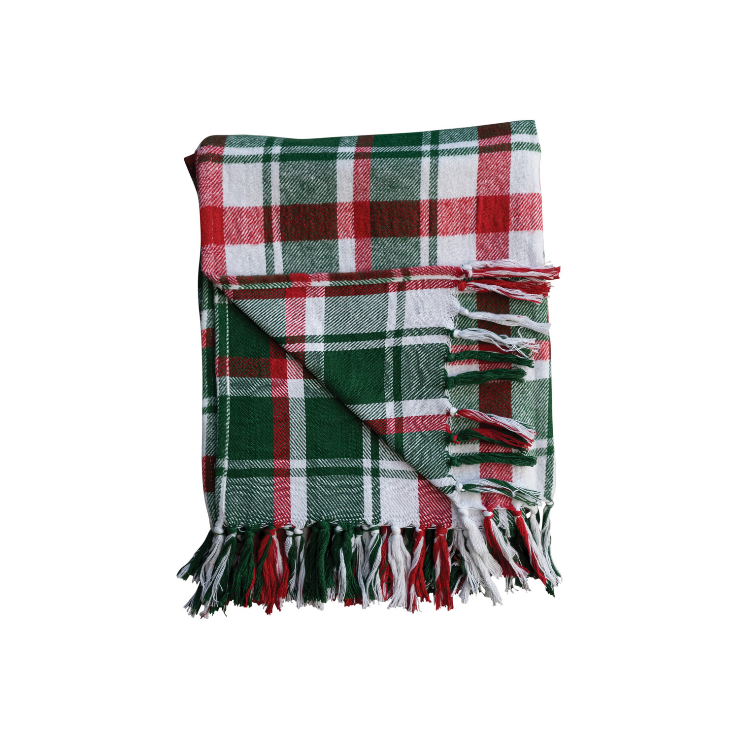 Catalog Name: 60"L x 50"W Brushed Cotton Flannel Throw w/ Fringe, Red, Green & White Plaid
