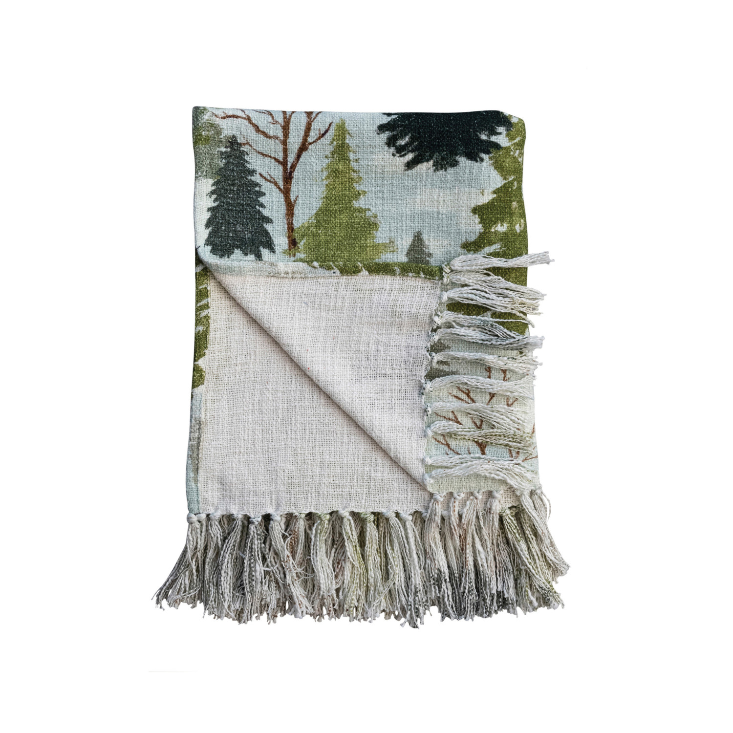 Catalog Name: 60"L x 50"W Cotton Slub Printed Throw w/ Trees Pattern & Fringe, Multi Color ©