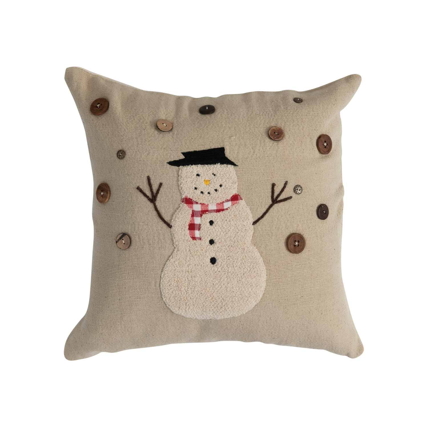 Catalog Name: 16" Square Cotton Pillow with Embroidered Snowman and Applique Buttons, Multi Color