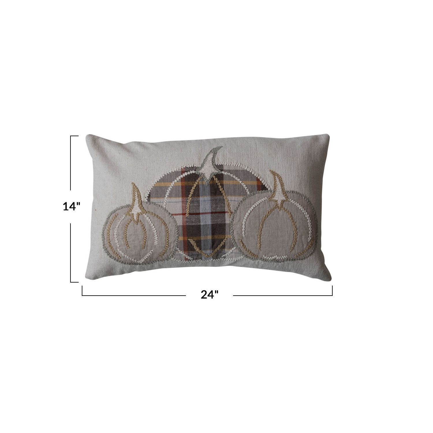 Catalog Name: 24"L x 14"H Cotton & Linen Slub Lumbar Pillow w/ Appliqued Pumpkins & Chambray Back, Natural & Multi Color Plaid