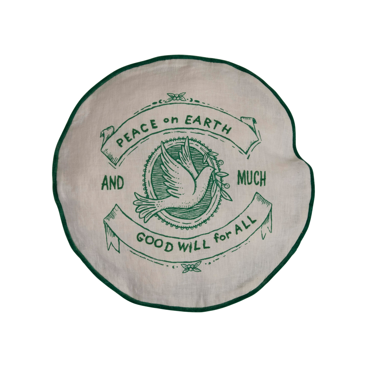 Catalog Name: 16" Round Cotton Printed Pillow with Embroidery, Piping and Velvet Back "Peace On Earth And Much Goodwill For All", White and Green