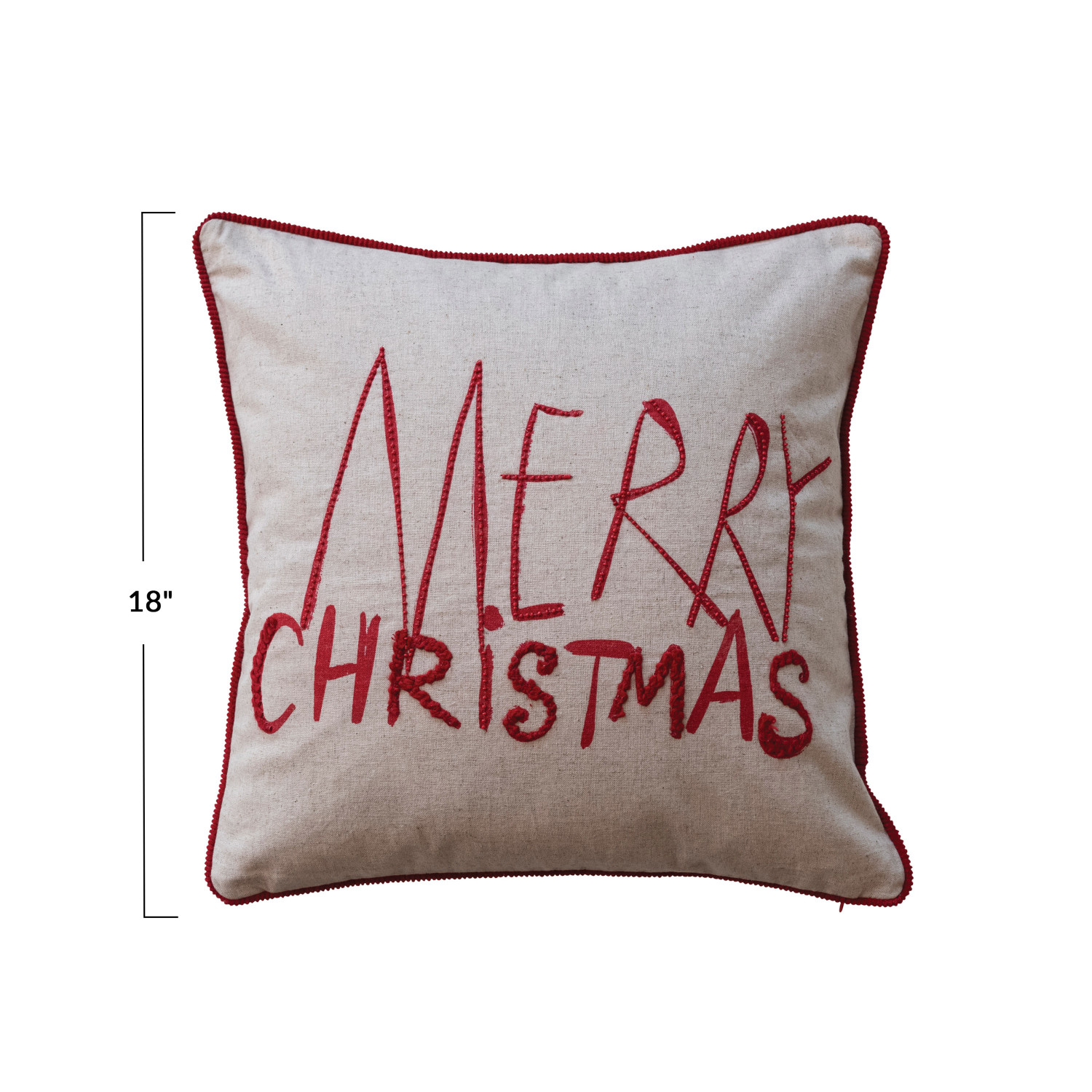 Catalog Name: 18" Square Cotton Printed Pillow w/ Embroidery, Corduroy Back & Piping "Merry Christmas", Natural & Red ©
