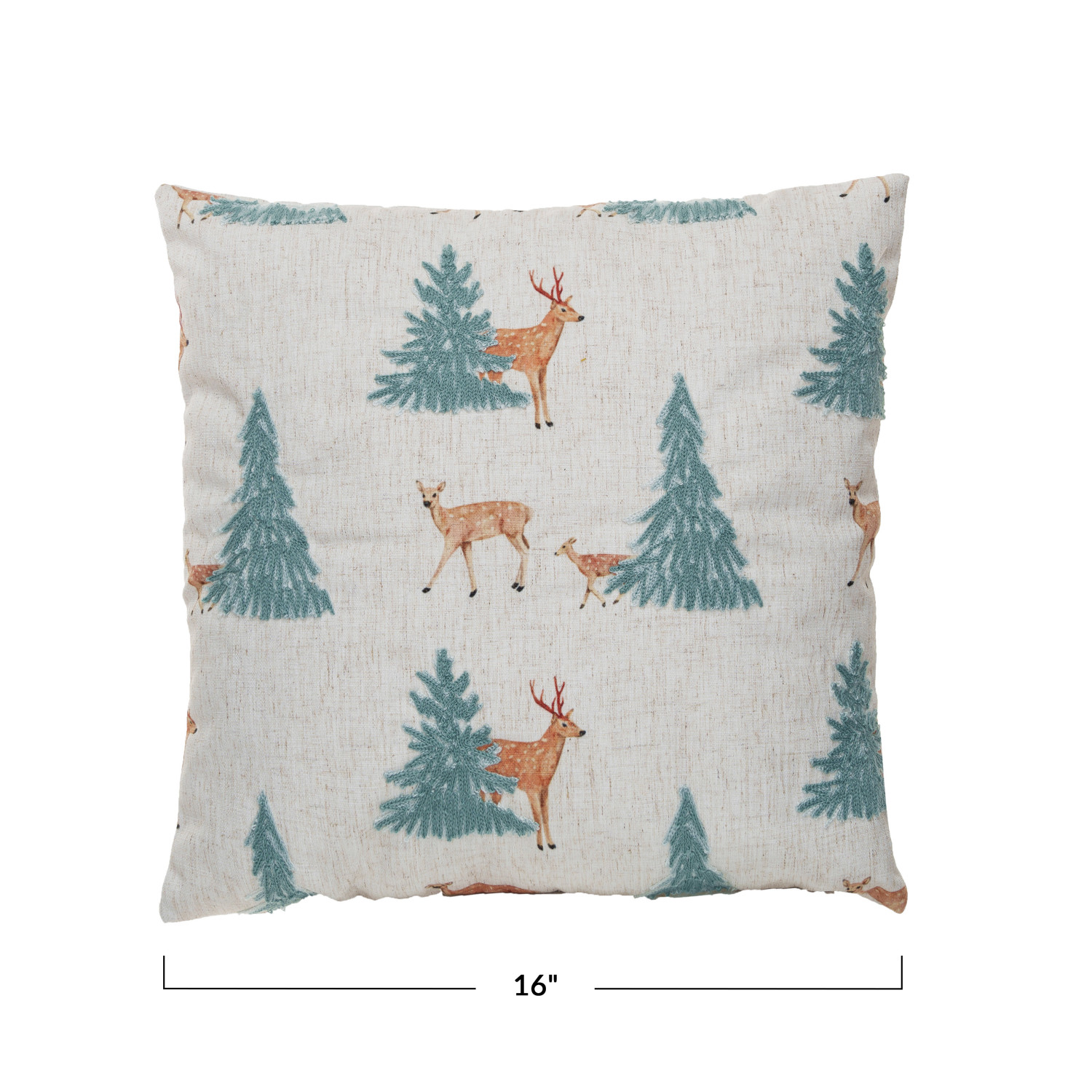 Catalog Name: 16" Square Fabric Blend Pillow w/ Embroidered Deer & Trees, Natural, Green & Brown