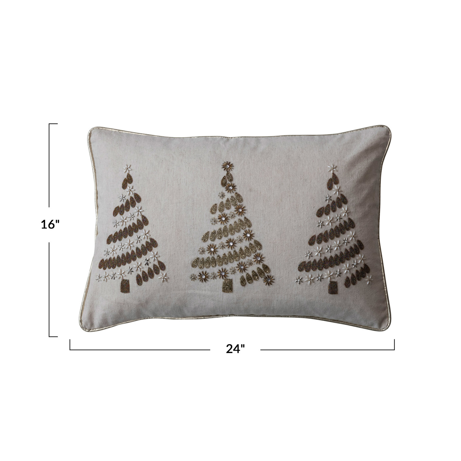 Catalog Name: 24"L x 16"H Cotton Lumbar Pillow w/ Embroidered Christmas Trees, Beads & Metallic Gold Piping, Natural, Cream & Gold Color
