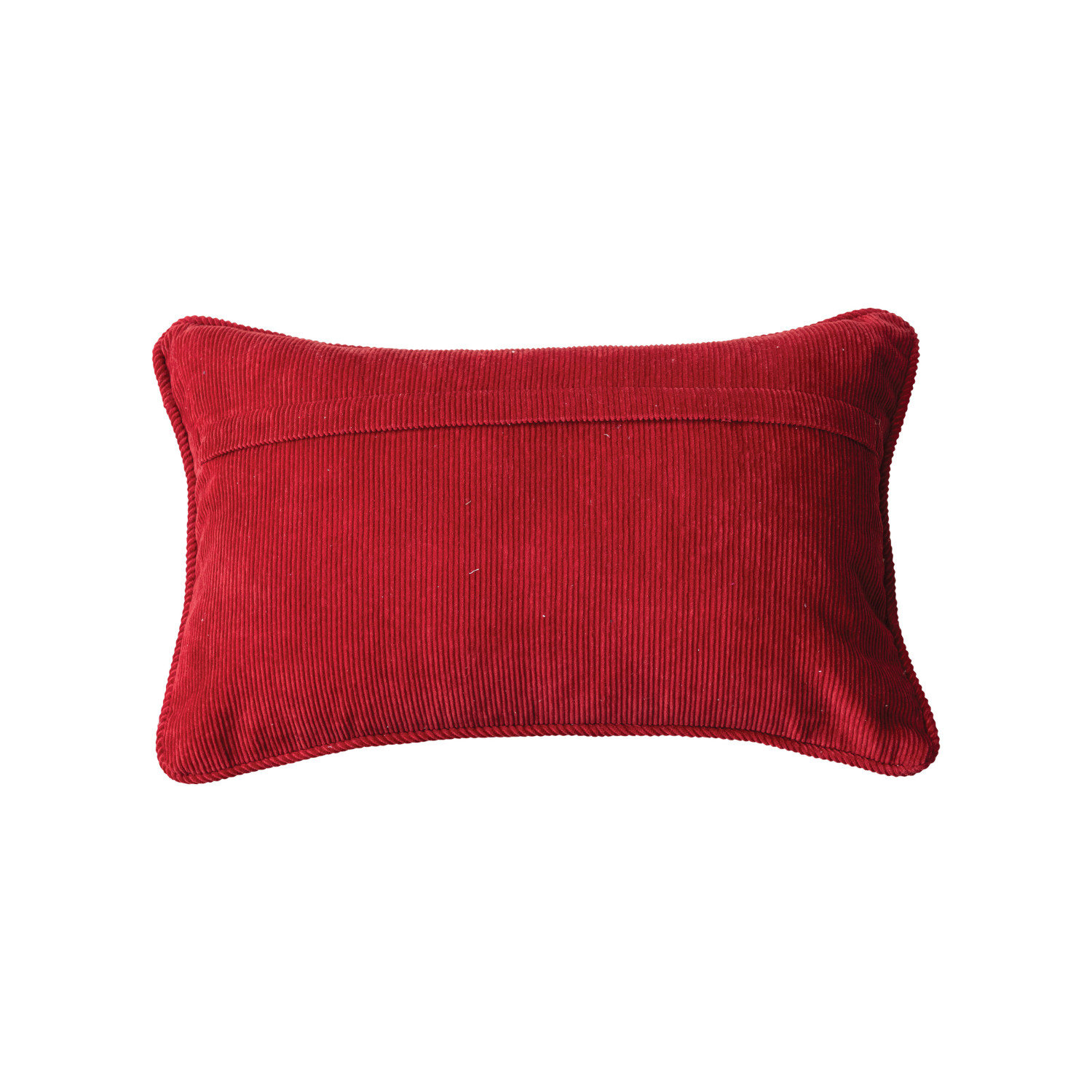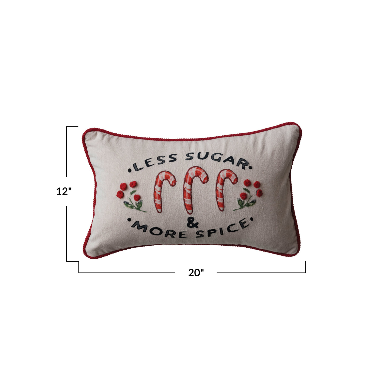 Catalog Name: 20"L x 12"H Cotton Printed Lumbar Pillow w/ Candy Canes, Embroidery, Pom Poms, Corduroy Back & Piping "Less Sugar, More Spice", Multi Color ©