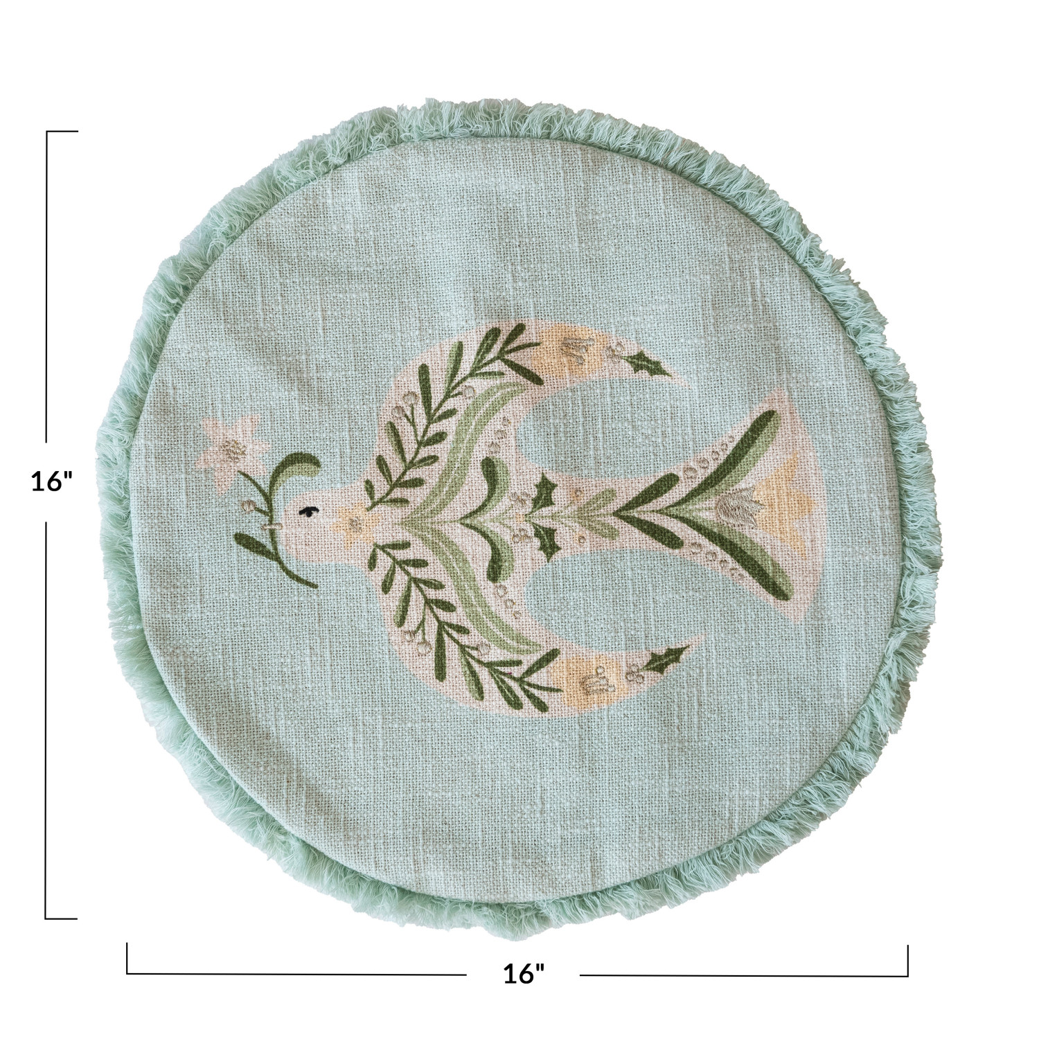 Catalog Name: 16" Round Cotton Printed Pillow w/ Embroidered Dove & Fringe, Multi Color ©