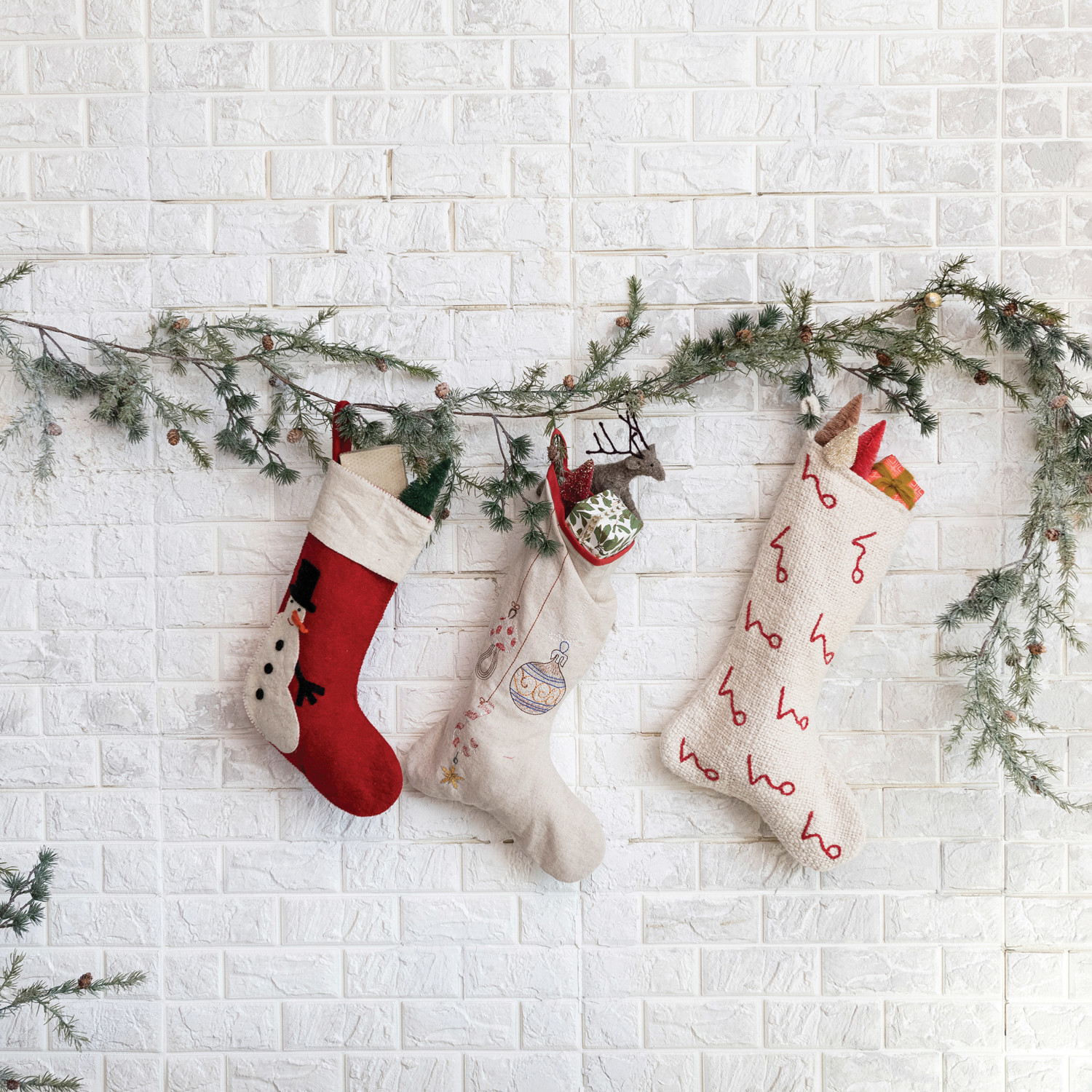 Catalog Name: 20"H Cotton & Linen Stocking w/ Embroidered Ornaments & Red Edge, Multi Color
