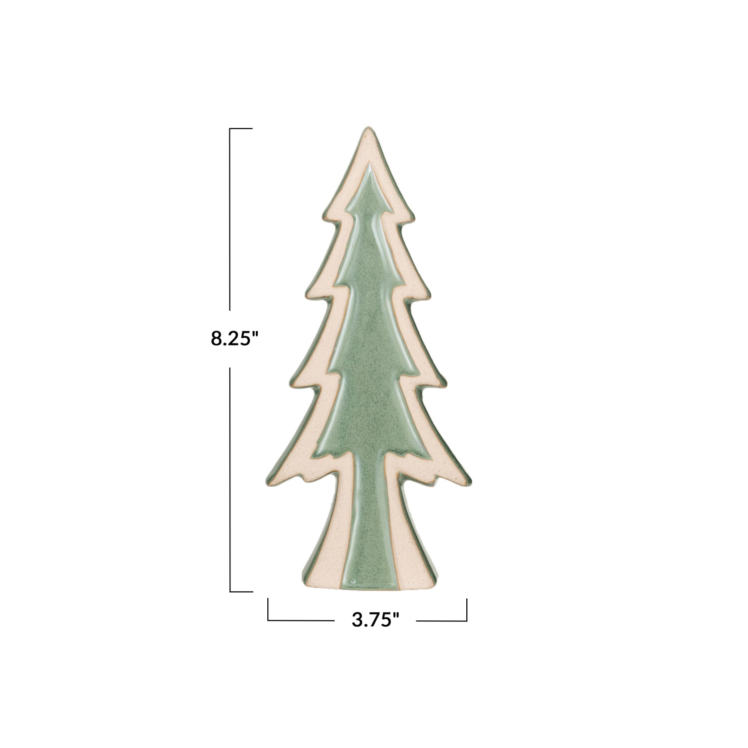 This green unglazed stoneware tree decor with reactive glaze is a beautiful and convenient way to decorate for the holidays. It features a sleek and simple stoneware tree decor with a reactive glaze that creates a unique pattern on each piece, making it a one-of-a-kind item. The tree decor has a green color that blends well with any space and style, adding a touch of sophistication and charm to the decor. The tree decor is ideal for displaying on a table, shelf, or mantel, where it can be used as a standalone piece or paired with other items. The tree decor is made of stoneware that is sturdy, durable, and easy to clean, making it a great choice for holiday decoration. It measures 3.75 inches in width and 8.25 inches in height, making it a subtle and attractive centerpiece. Elevate the holiday decor with this eye-catching Christmas tree, adding both style and a touch of whimsy. A sleek and simple stoneware tree decor with a reactive glaze that creates a unique pattern on each piece. A versatile and elegant addition to the holiday decor, this tree decor suits any space and style. Ideal for displaying on a table, shelf, or mantel, this tree decor can be used as a standalone piece or paired with other items.